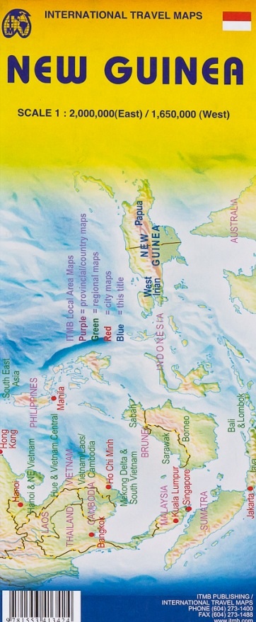 Wegenkaart Nieuw-GuineaThe South Pacific island of New Guinea is divided between two countries: The eastern, and somewhat more developed half, is the Republic of Papua New Guinea, and the western portion is the Indonesian province of West Irian. One side of the map shows the eastern portion, along with the nearby islands of the Bismarck Archipelago and Bougainville Island of the Solomons. Whatever roads exist are shown, but most people fly from one destination to another. The West Irian side can best be visited by inter-island boats, as roads are few. Several other Indonedian islands are included on this side, of which Seram/Ceram and Ambon are probably the best known. Most of East Timor is shown as well. This is definitely an'off the beaten path' travel destination, but it sells surprisingly well!