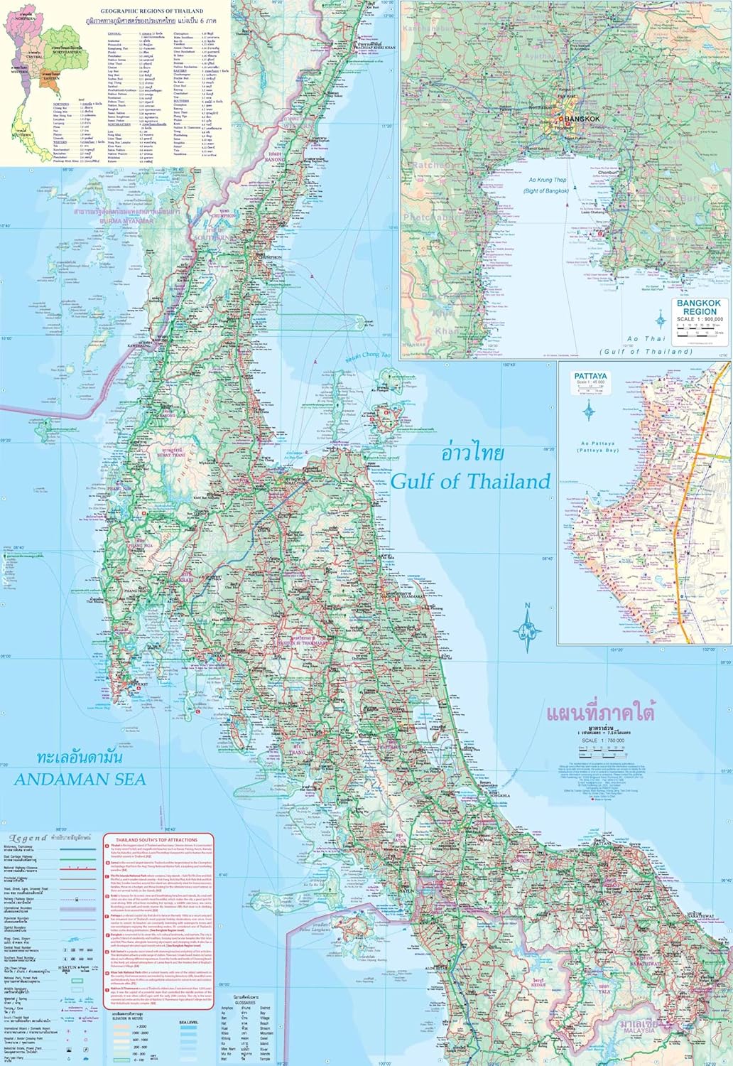 Duidelijke wegenkaart met op de ene zijde de kaart van Bangkok op een goede schaal met veel toeristische informatie. De andere kant heeft het hele zuiden van Thailand .