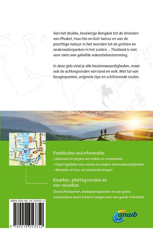 ANWB Wereldreisgids Thailand De ANWB Wereldreisgids Thailand is een complete en praktische reisgids voor jouw droomvakantie door Thailand. Het land van witte stranden en felblauwe zeen, immense watervallen en glooiende rijstvelden. Maar ook van grote steden vol bezienswaardigheden zoals de klongs in Bangkok en de oude tempels van Ayutthaya. De uitgebreide Thailand reisgids telt meer dan 400 pagina’s boordevol hoogtepunten, originele tips, schitterende wandelroutes en alles over de achtergronden van land en volk. Daarnaast alle praktische informatie zoals openingstijden van musea, tips voor overnachtingen en vervoerstijden. Ook handig: diverse suggesties voor lange en korte rondreizen door de streek. Inclusief stadsplattegronden, overzichtskaarten en achterin een grote uitneembare kaart. Kortom: een onmisbare ANWB gids voor een geweldige rondreis door Thailand.