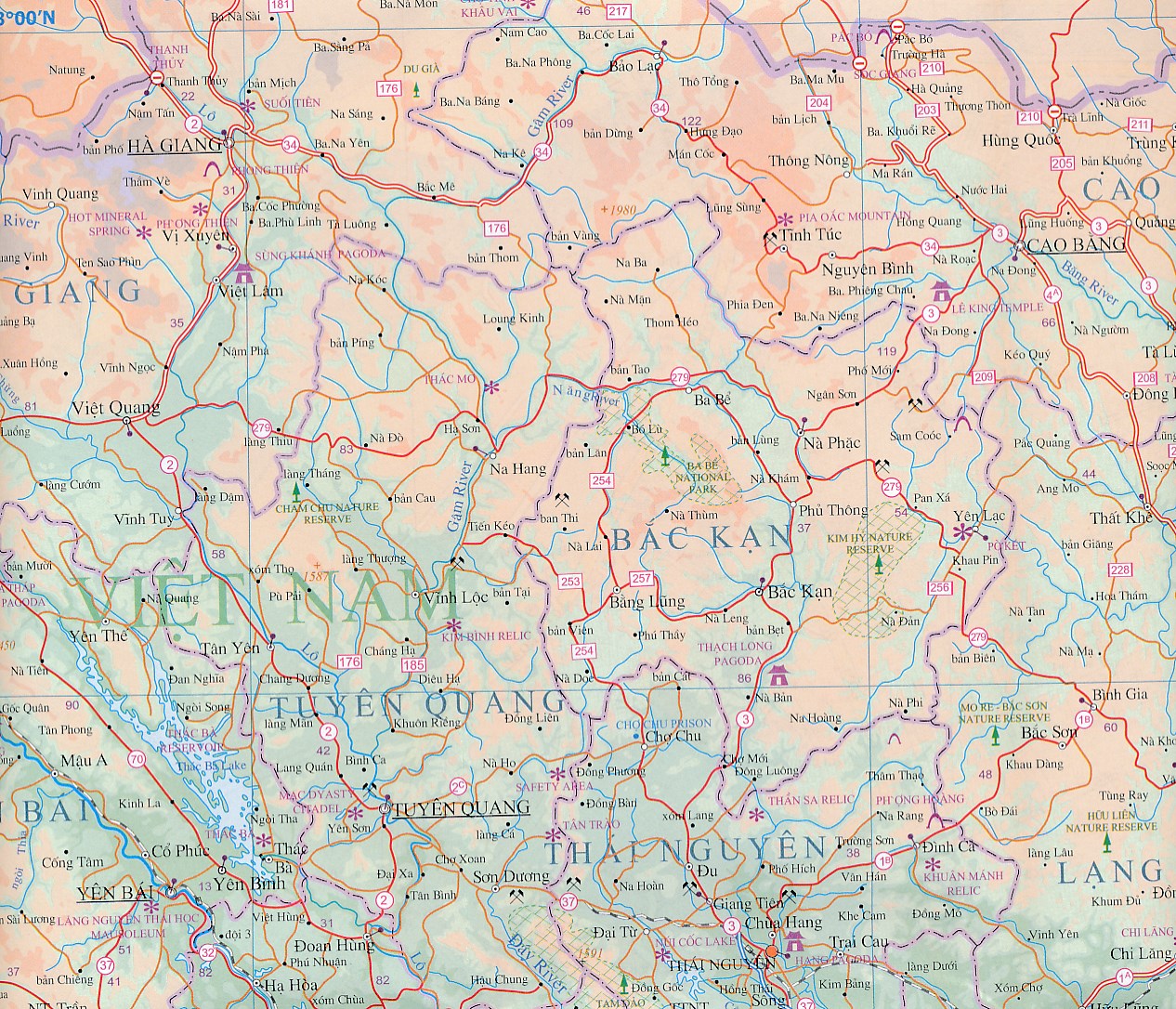 Double-sided map with north Vietnam on one side and a street plan of Hanoi on the reverse. The road map at 1:920,000 shows the area’s road and rail networks and local airports. National parks, nature reserves, beaches and numerous places of interest are highlighted. Provincial boundaries are marked and names of administrative regions prominently shown. Topography is indicated by altitude colouring. Latitude and longitude lines are drawn at 30’ intervals.