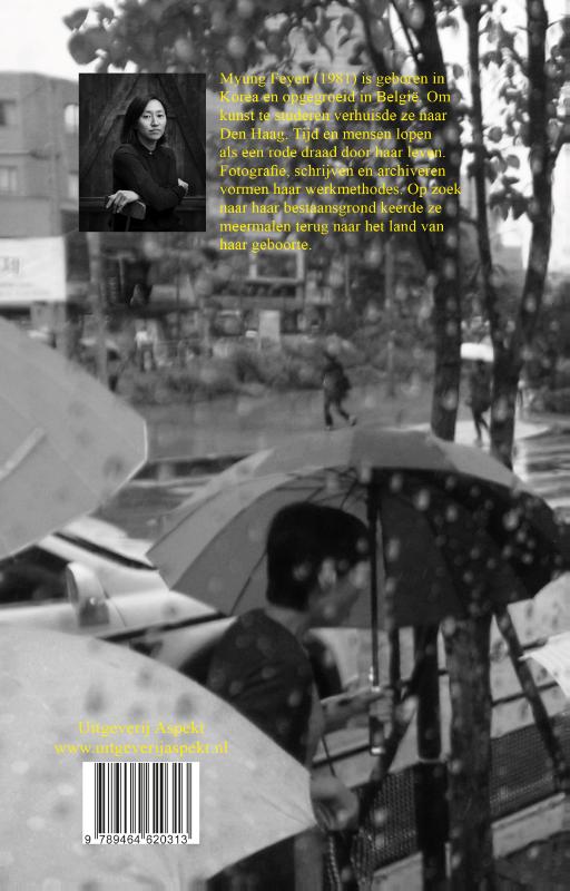 Koreaanse reisverhalen van een geadopteerde Myung Feyen (1981) is geboren in Korea en opgegroeid in België. Om kunst te studeren verhuisde ze naar Den Haag. Tijd en mensen lopen als een rode draad door haar leven. Fotografie, schrijven en archiveren vormen haar werkmethodes. Op zoek naar haar bestaansgrond keerde ze meermalen terug naar het land van haar geboorte.