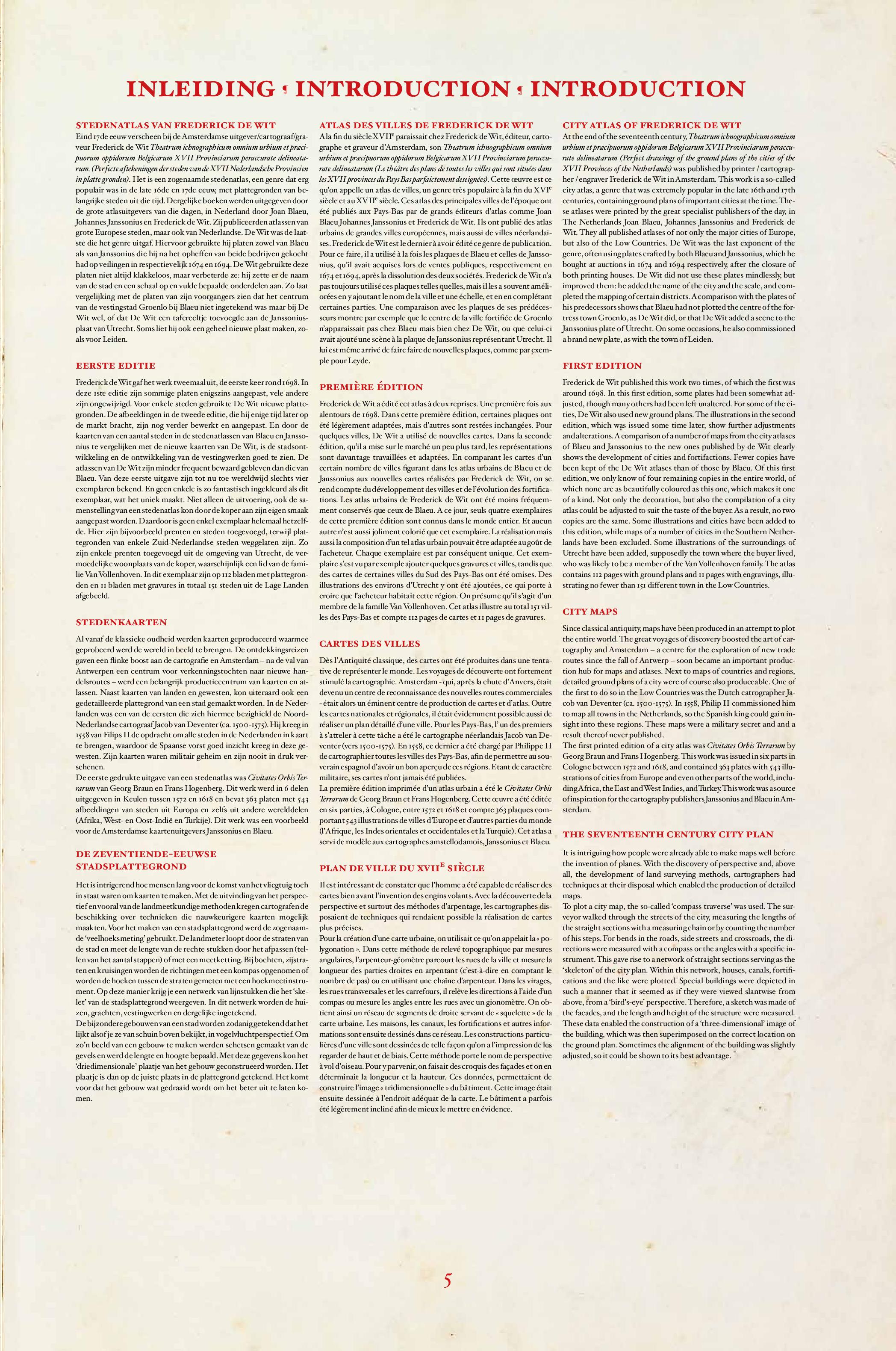 Frederick de Wit gaf het werk tweemaal uit, de eerste keer rond 1698. In deze 1ste editie zijn sommige platen enigszins aangepast, vele andere zijn ongewijzigd. Voor enkele steden gebruikte De Wit nieuwe plattegronden. De afbeeldingen in de tweede editie, die hij enige tijd later op de markt bracht, zijn nog verder bewerkt en aangepast. En door de kaarten van een aantal steden in de stedenatlassen van Blaeu en Janssonius te vergelijken met de nieuwe kaarten van De Wit, is de stadsontwikkeling en de ontwikkeling van de vestingwerken goed te zien. De atlassen van De Wit zijn minder frequent bewaard gebleven dan die van Blaeu. Van deze eerste uitgave zijn tot nu toe wereldwijd slechts vier exemplaren bekend. En geen enkele is zo fantastisch ingekleurd als dit exemplaar, wat het uniek maakt. Niet alleen de uitvoering, ook de samenstelling van een stedenatlas kon door de koper aan zijn eigen smaak aangepast worden. Daardoor is geen enkel exemplaar helemaal hetzelfde. Hier zijn bijvoorbeeld prenten en steden toegevoegd, terwijl plattegronden van enkele Zuid-Nederlandse steden weggelaten zijn. Zo zijn enkele prenten toegevoegd uit de omgeving van Utrecht, de vermoedelijke woonplaats van de koper, waarschijnlijk een lid van de familie Van Vollenhoven. In dit exemplaar zijn op 112 bladen met plattegronden en 11 bladen met gravures in totaal 151 steden uit de Lage Landen afgebeeld.