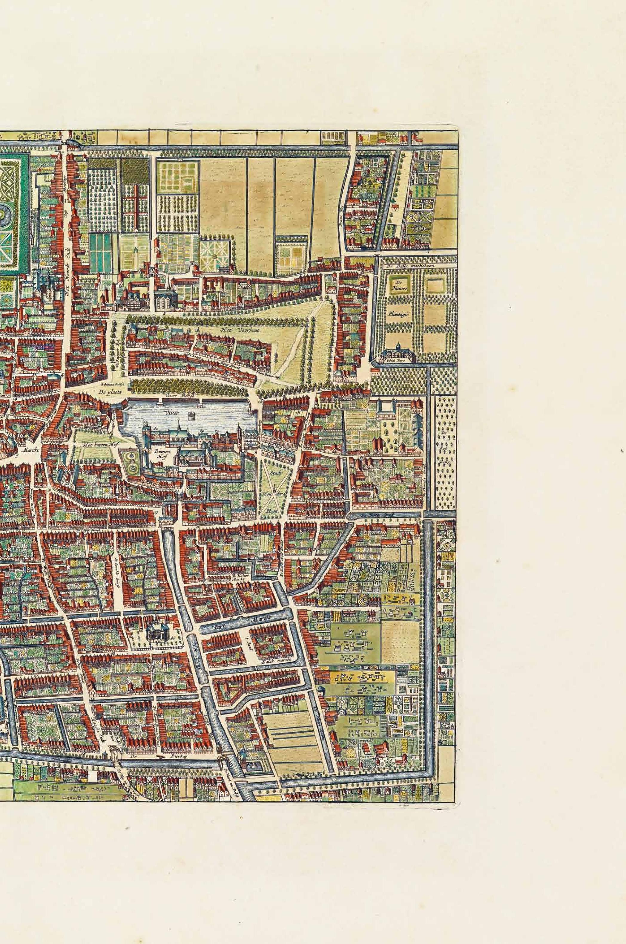 Het is intrigerend hoe mensen lang voor de komst van het vliegtuig toch in staat waren om kaarten te maken. Met de uitvinding van het perspectief en vooral van de landmeetkundige methoden kregen cartografen de beschikking over technieken die nauwkeurigere kaarten mogelijk maakten. Voor het maken van een stadsplattegrond werd de zogenaamde ‘veelhoeksmeting’ gebruikt. De landmeter loopt door de straten van de stad en meet de lengte van de rechte stukken door het afpassen (tellen van het aantal stappen) of met een meetketting. Bij bochten, zijstraten en kruisingen worden de richtingen met een kompas opgenomen of worden de hoeken tussen de straten gemeten met een hoekmeetinstrument. Op deze manier krijg je een netwerk van lijnstukken die het ‘skelet’ van de stadsplattegrond weergeven. In dit netwerk worden de huizen, grachten, vestingwerken en dergelijke ingetekend. De bijzondere gebouwen van een stad worden zodanig getekend dat het lijkt alsof je ze van schuin boven bekijkt, in vogelvluchtperspectief. Om zo’n beeld van een gebouw te maken werden schetsen gemaakt van de gevels en werd de lengte en hoogte bepaald. Met deze gegevens kon het ‘driedimensionale’ plaatje van het gebouw geconstrueerd worden. Het plaatje is dan op de juiste plaats in de plattegrond getekend. Het komt voor dat het gebouw wat gedraaid wordt om het beter uit te laten komen.