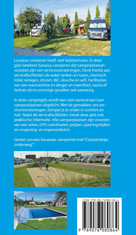 Voor alle camperaars die op een camperplaats graag de beschikking hebben over servicevoorzieningen is "Camperstops onderweg - Luxueus camperen" de ideale campergids. Deze praktische campergids is speciaal samengesteld voor camperaars die het belangrijk vinden dat een camperplaats beschikt over servicevoorzieningen en/of camperaars die hier gebruik van maken. Met een selectie van 1.075 camperplaatsen die allen voorzien zijn van alle servicefaciliteiten: Water tanken, Water lozen, Chemisch toilet, Stroom, WC, Douche, WIFI (wasmachine/droger optioneel) en in sommige gevallen zelfs zwembad, sauna of hottub, beschik jij als camperaar over een ruim aanbod van camperplaatsen om luxueus te camperen. Alle 1.075 camperplaatsen in deze campergids worden o.a. getoond incl. foto, adres, GPS-coördinaten, tarieven, openingstijden, geboden servicefaciliteiten & praktische informatie m.b.t. de omgeving. De ideale reisgenoot voor wanneer je luxe op reis wilt met de camper!Reviews