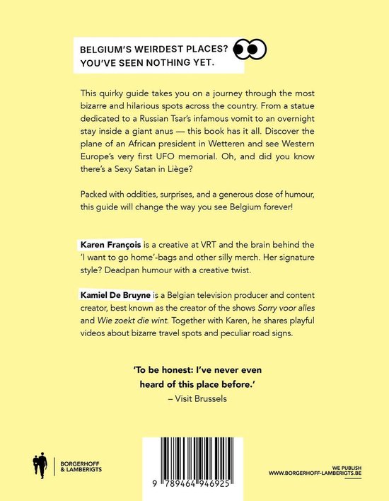 This quirky guide takes you on a journey through the most bizarre and hilarious spots across the country. From a statue dedicated to a Russian Tsar's infamous vomit to an overnight stay inside a giant anus—this book has it all. Discover the plane of an African president in Wetteren and see Europe’s very first UFO memorial. Oh, and did you know there's a Sexy Satan in Liège? Packed with oddities, surprises, and a generous dose of humor, this guide will change the way you see Belgium forever!Reviews