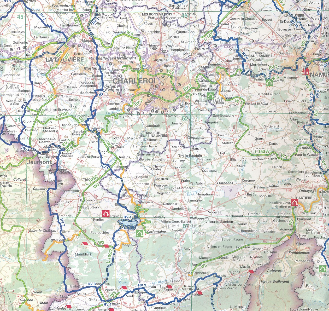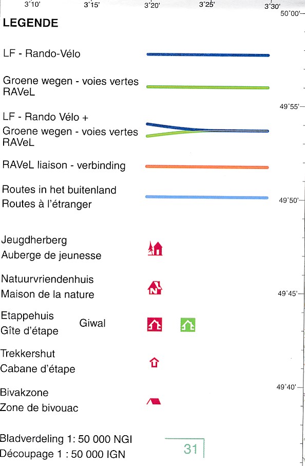 De Langeafstandsfietsroutes door België staan allemaal op deze fietskaart. Ze heten ook wel de LF en RV routes, Rando-Velo et RAVel, of groene wegen ( voies vertes). De toelichting bij deze kaart en de uitleg over de fietsroutes is in het Nederlands, Frans, Engels en Duits. Deze fietskaart is een mooie overzichtskaart waarop de routes zijn ingetekend en jeugdherbergen, natuurvriendenhuizen, campings en gite d'Etape staan aangegeven.