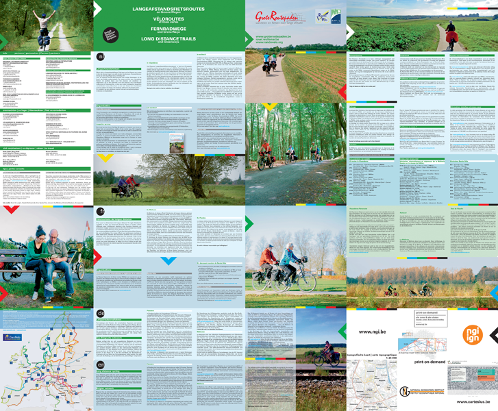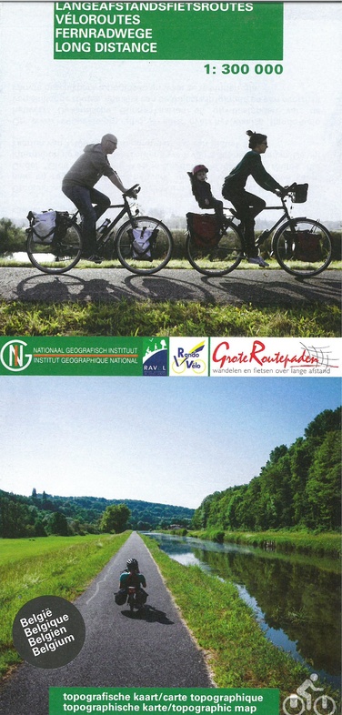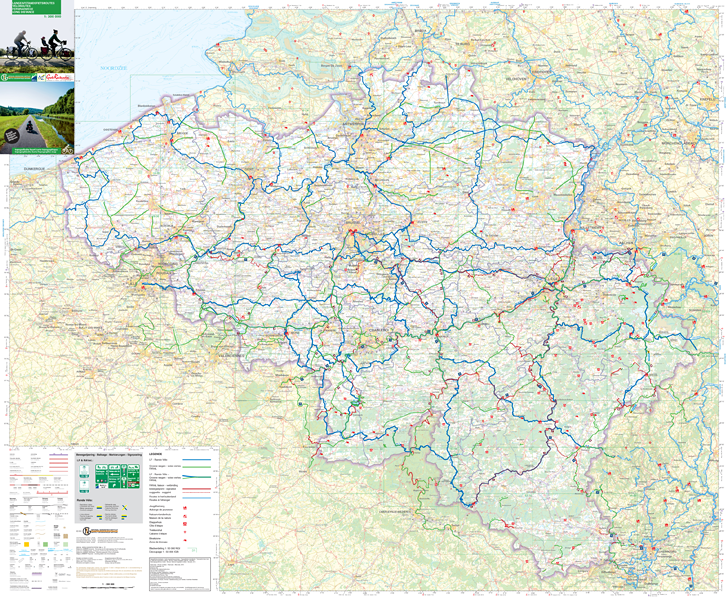 De voorzijde bestaat uit een topografische kaart van België en de grensregio's op een schaal van 1:300 000. Hierop staan alle Vlaamse LF-routes en Groene Wegen aangeduid, de Waalse Rando Vélo's en RAVeLs, én de aansluitende fietsroutes in de buurlanden. Goed voor meer dan 4500 km bewegwijzerde Belgische fietstrajecten. Een ideaal overzicht dus!