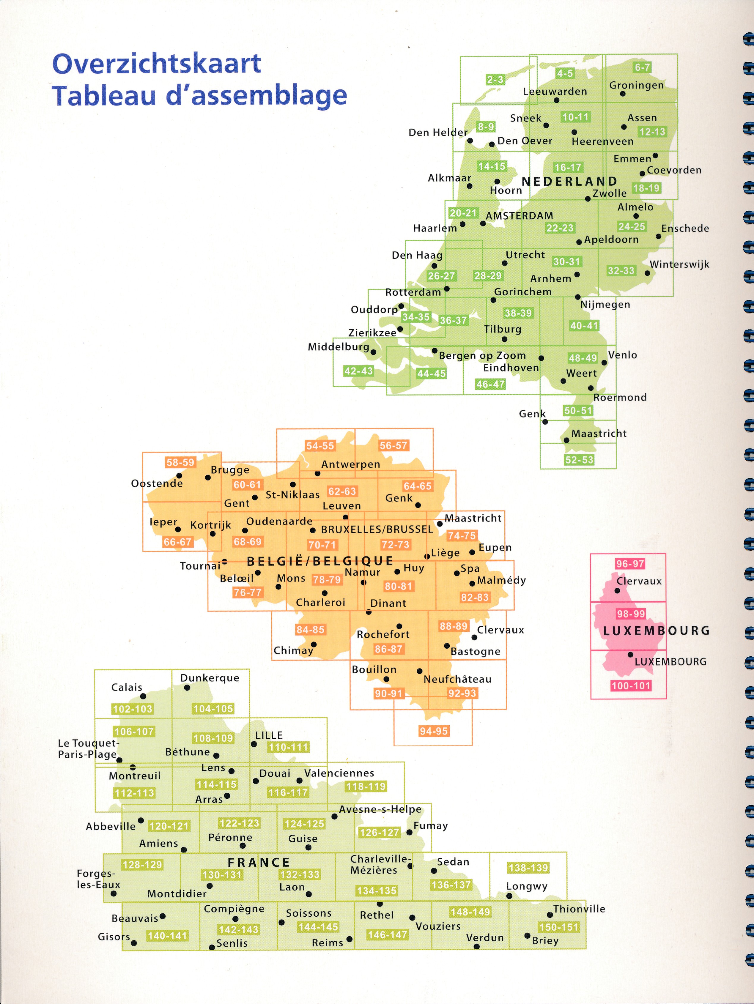 Toeristische wegenatlas van de Benelux met duidelijke en gedetailleerde wegenkaarten van Michelin op een schaal van 1:150.000 Nederland, België en Luxemburg en zelfs Noord-Frankrijk samen in een wegenboek. In de binnenkaft zit een kaart met duidelijke paginaverwijzing.