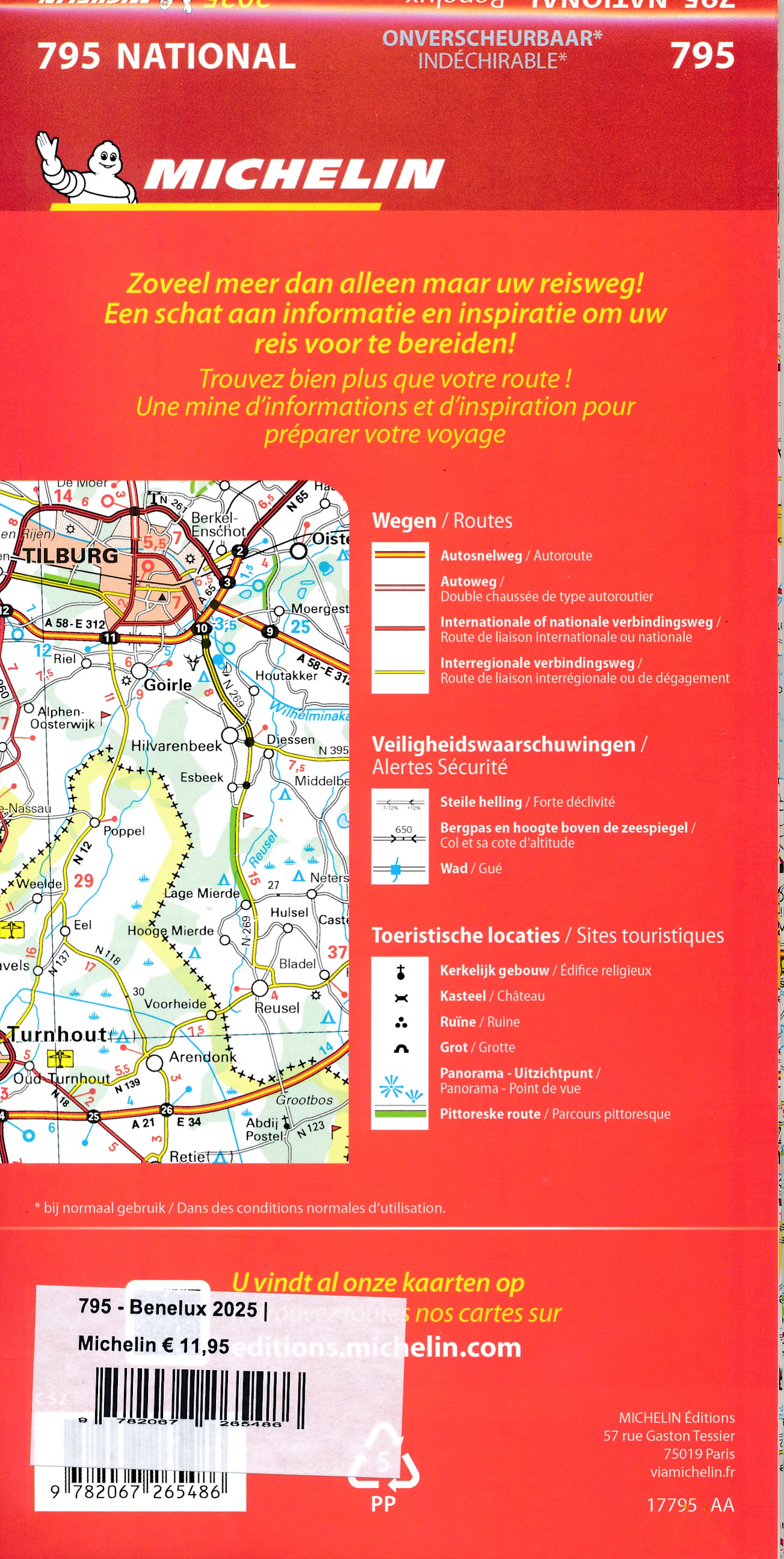 Benelux at 1:400,000 from Michelin, with information on driving regulations in each country, a distance and journey time table, plus enlargements showing in greater detail road access to Amsterdam, Brussels and Luxembourg City. Coverage extends east to include the Ruhr and the Eifel in Germany.