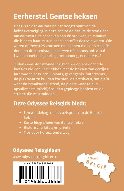 Eerherstel Gentse heksen Ongeveer vier eeuwen na het hoogtepunt van de heksenvervolging in onze contreien beslist de stad Gent om eerherstel te schenken aan de vrouwen en mannen die binnen haar muren het slachtoffer daarvan waren. Wie waren de zowat 25 vrouwen en mannen die een vreselijke dood op de brandstapel stierven of er soms ook vanaf kwamen met een geseling, verbanning, een boete…? Tijdens een stadswandeling gaan we op zoek naar de locaties die een link hebben met de heksen van eertijds: hun woonplaats, schuilplaats, gevangenis, folterkamer, de plek waar ze kruiden kochten, de archieven, het plein waar de brandstapel stond, de plaats waar ze hun opvallendste misdrijf zouden gepleegd hebben en de straten die ze aandeden. Deze Odyssee Reisgids biedt: - Een wandeling in het voetspoor van de Gentse heksen - Korte biografieën van Gentse heksen - Historische foto's en prenten - Tips voor horeca onderweg
