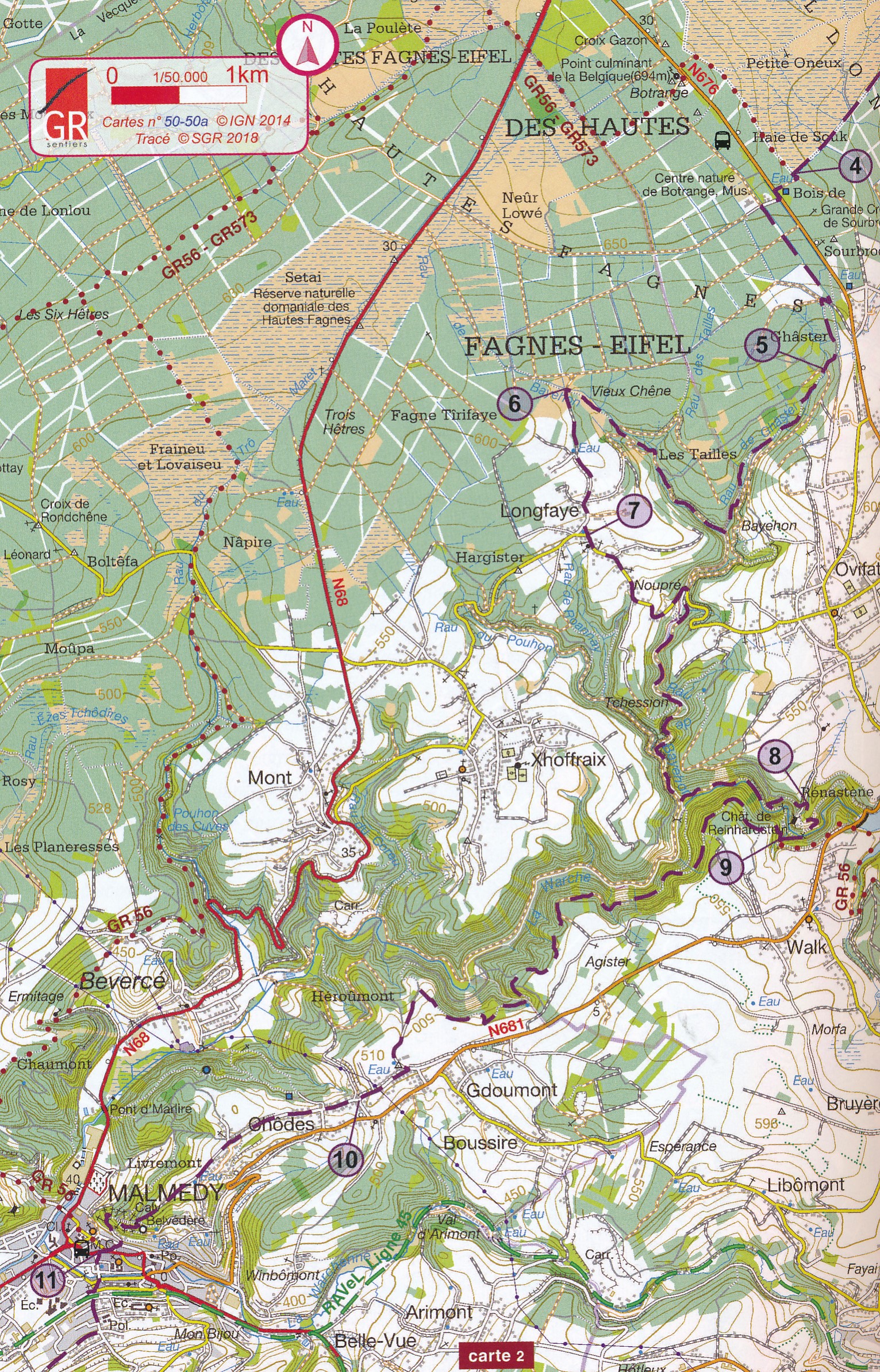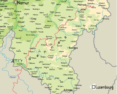 Bewegwijzering: wit-rode GR-markerig, in twee richtingen bewegwijzerdAfstand: 276 kmTraject: Monschau - Malmedy- Trois-Ponts - Lierneux - La Roche-en-Ardenne, Saint-Hubert - Bouillon - Sedan