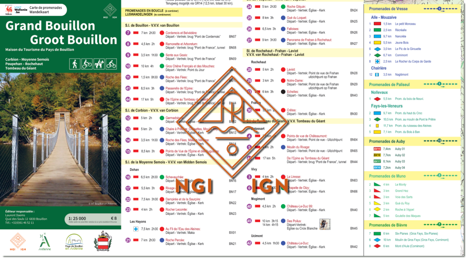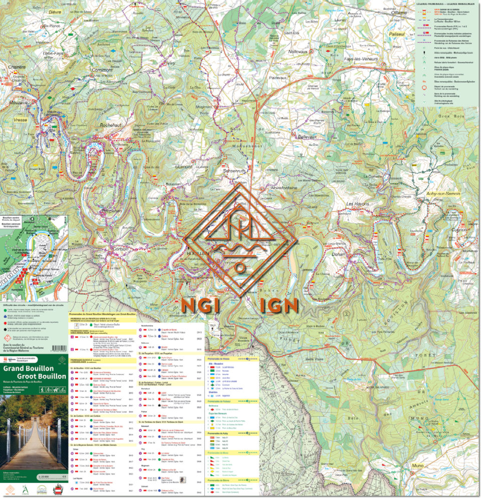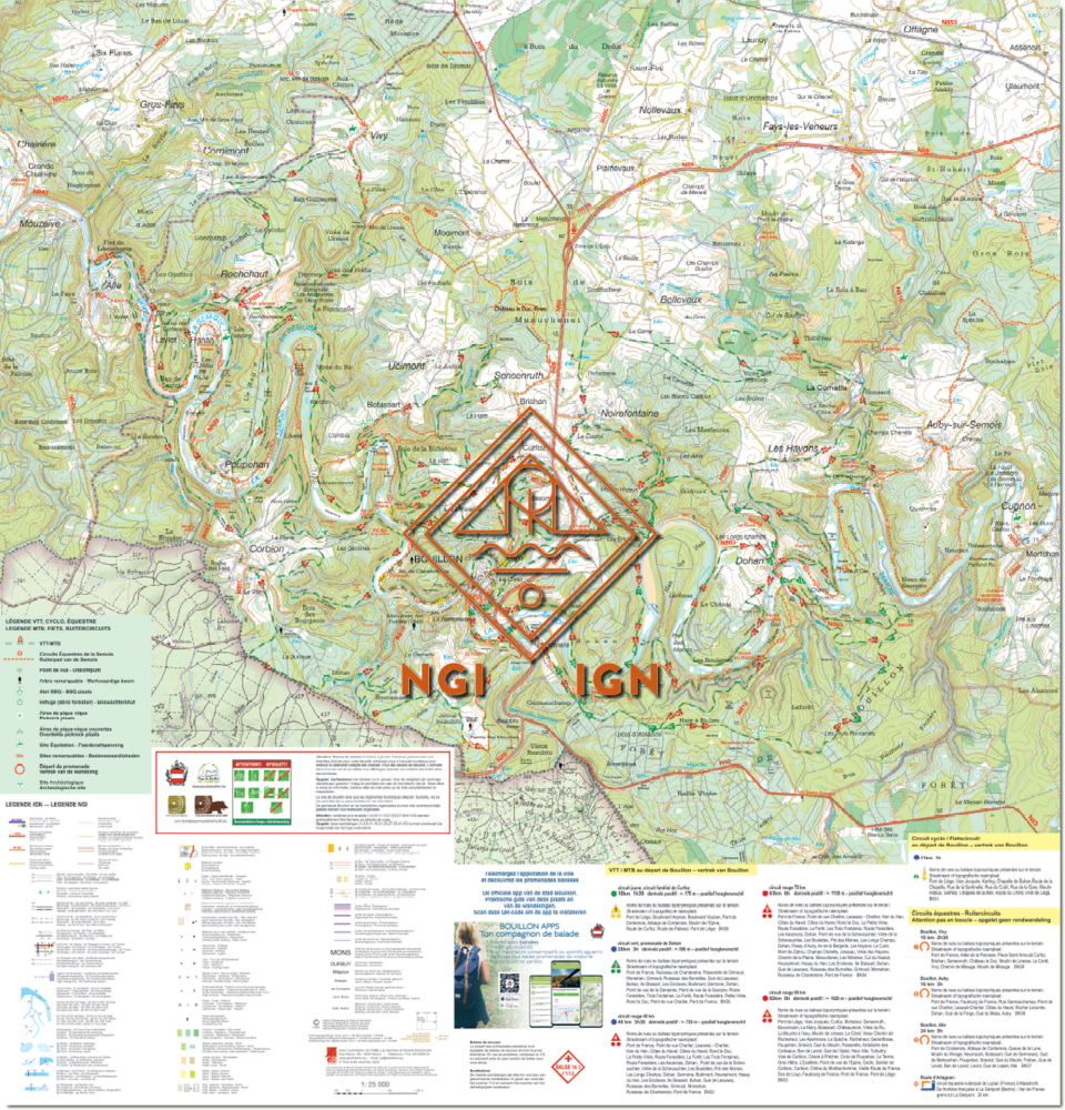 Wandelkaart en mountainbike-kaart in één de omgeving van Bouillon. Op beide zijden is dezelfde kaart gedrukt, met aan een zijde tal van ingetekende wandelroutes, en aan de andere zijde mountainbikeroutes. De routes zijn voorzien van de markeringen die u ook in het veld tegenkomt. Ze zijn opgedeeld per vertrekpunt, en de lengte en moeilijkheidsgraad van elke route staat aangegeven. Inclusief een detailkaartje van het centrum van Bouillon.