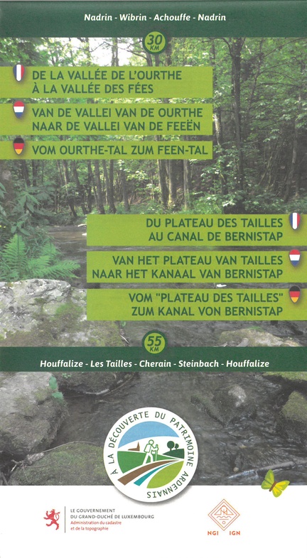 Wandelkaart met twee routes: Van de Vallei van de Ourthe naar de Vallei van de Feeën (30km) en Van het Plateau van Tailles naar het Kanaal van Bernistap (55km). Goede schaal en duidelijke route ingetekend. Met beschrijvingen van bezienswaardigheden.