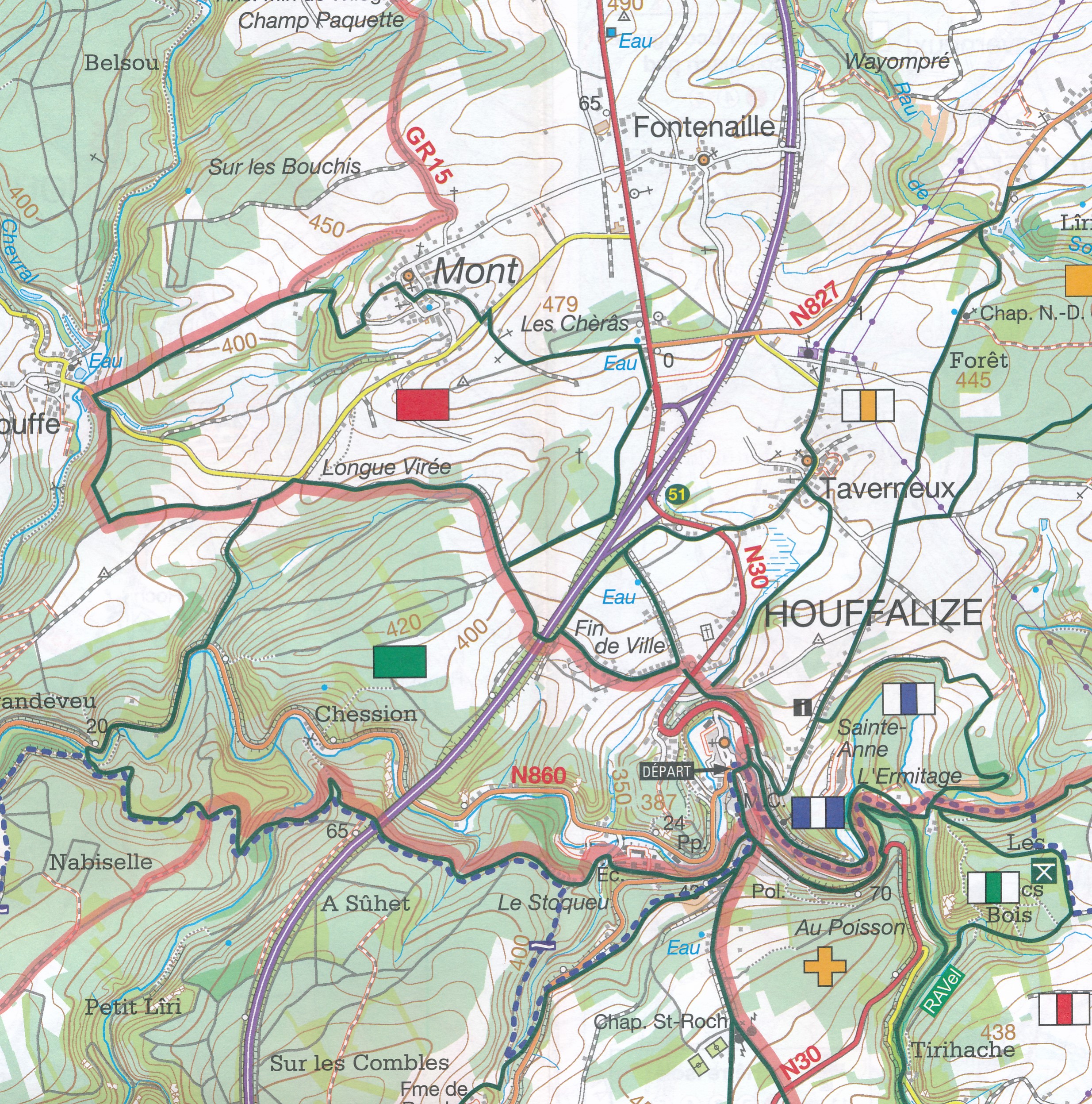 Houffalize, Tavigny, Bœur, Buret, Steinbach, Alhoumont, Cetturu, Cowan, Dinez, Fontenaille, Mabompré, Mont, Sommerain, Taverneux, Vissoule, WandebourcyTopografische kaart met: