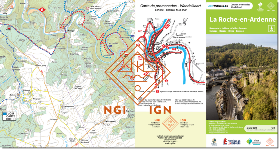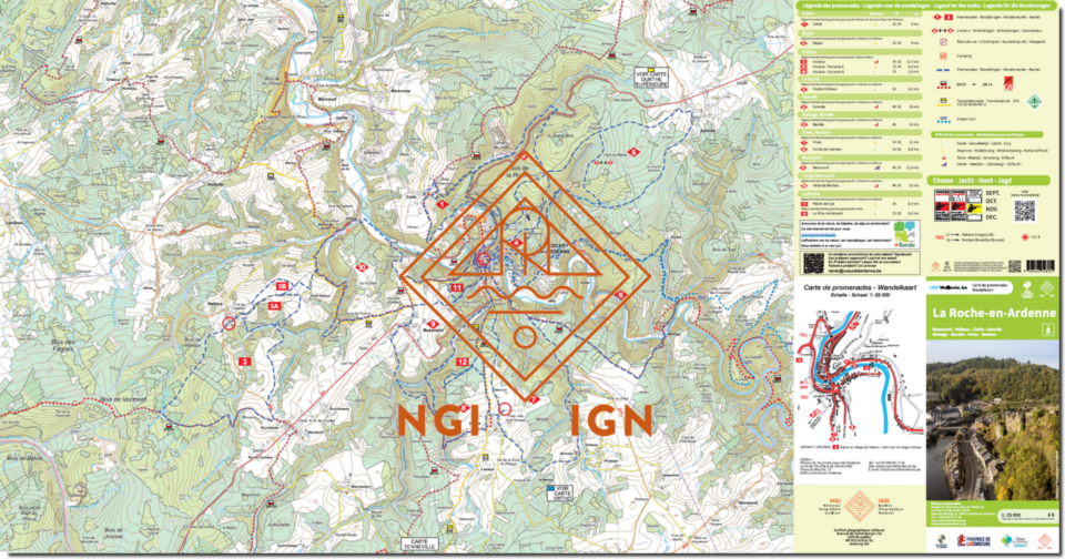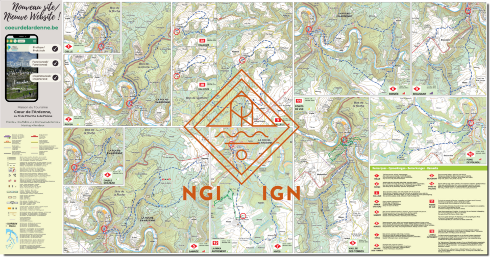 Dit is een fijne wandelkaart van de directe omgeving van La Roche. Er staan duidelijk aangegeven wandelroutes op die meestal vertrekken vanuit La Roche