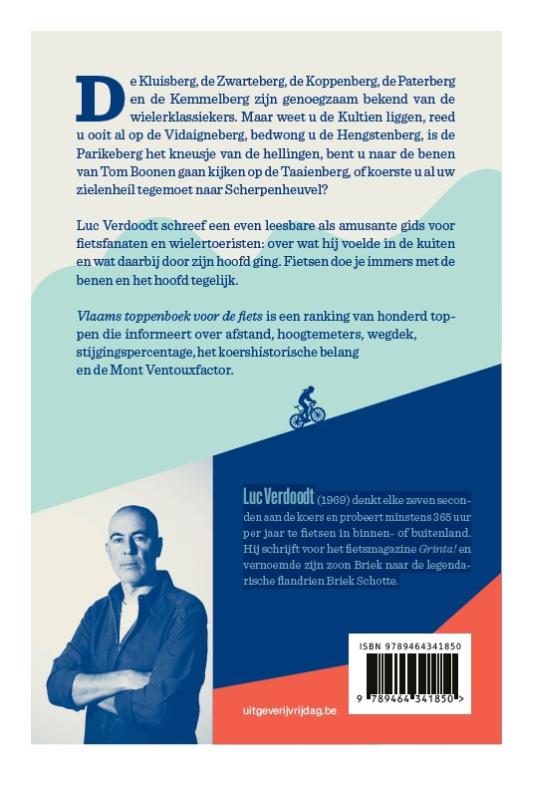 De Kluisberg, de Zwarteberg, de Koppenberg, de Paterberg en de Kemmelberg zijn genoegzaam bekend van de wielerklassiekers. Maar weet u de Kultien liggen, reed u ooit al op de Vidaigneberg, bedwong u de Hengstenberg, is de Parikeberg het kneusje van de hellingen, bent u naar de benen van Tom Boonen gaan kijken op de Taaienberg, of koerste u al uw zielenheil tegemoet naar Scherpenheuvel? Luc Verdoodt schreef een even leesbare als amusante gids voor fietsfanaten en wielertoeristen: over wat hij voelde in de kuiten en wat daarbij door zijn hoofd ging. Fietsen doe je immers met de benen en het hoofd tegelijk. Vlaams toppenboek voor de fiets is een ranking van honderd toppen die informeert over afstand, hoogtemeters, wegdek, stijgingspercentage, het koershistorische belang en de Mont Ventouxfactor. Luc Verdoodt (1969) denkt elke zeven seconden aan de koers en probeert minstens 365 uur per jaar te fietsen in binnen- of buitenland. Hij schrijft voor het fietsmagazine Grinta! en vernoemde zijn zoon Briek naar de legendarische flandrien Briek Schotte.