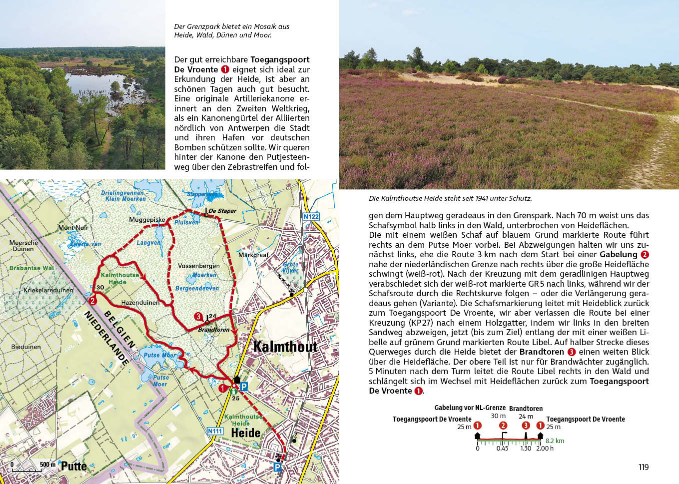 Die Wanderungen lassen malerische Küsten erkunden, stille Kanäle und sprudelnde Bäche. Parks und dichte Wälder, die das typische Bild der flämischen Landschaft prägen, laden zum Verweilen ein, Heide- und Dünenlandschaften zu ausgedehnten Wanderungen. Charmante Dörfer und historische Orte säumen die Routen. Besonders reizvoll sind die Stadtwanderungen in Brüssel, Brügge, Antwerpen und Gent – Städte, die mit ihrem historischen Flair und kulturellen Reichtum begeistern.
