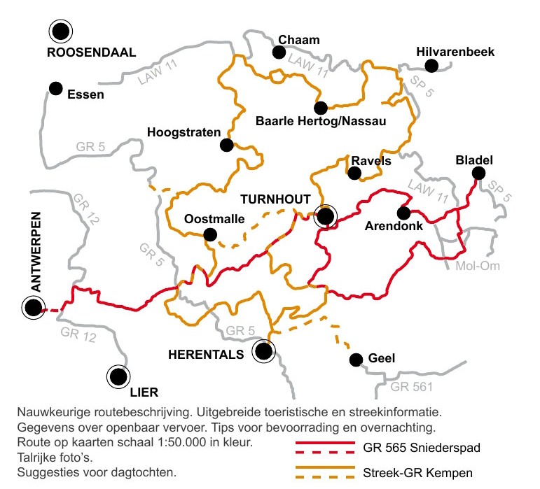 De GR 565, het Sniederspad en eveneens het oudste langeafstandswandelpad van Vlaanderen, voert over 121 km van Antwerpen tot Bladel, net over de Nederlandse grens. De route is zoals steeds in twee richtingen bewegwijzerd met de bekende wit-rode streepjes. De GR biedt de wandelaar een schitterend parklandschap. Dan de bossen van de Lilse Bergen, die de herinneringen doen ontwaken. En vervolgens een mix van fraaie landschappen langs kanalen, weiden en heide : een evenwicht van licht en groen.