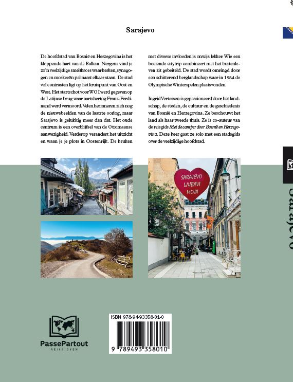 Sarajevo is de hoofdstad van Bosnië en Herzegovina en het kloppend hart van de Balkan. Nergens ter wereld vind je zo’n veelzijdige smeltkroes waar orthodoxe en katholieke kerken, synagogen en moskeeën bijna pal naast elkaar staan. Sarajevo ademt geschiedenis. De Romeinse, Byzantijnse, Ottomaanse en Habsburgse veroveraars lieten overal hun sporen na en dat zie je nog steeds. Het is een stad vol contrasten en verrassingen op het kruispunt van oost en west. De plek kende een turbulent verleden. Het startschot voor WO I werd gegeven op de Latijnse brug waar aartshertog Franz-Ferdinand van Oostenrijk en zijn vrouw koelbloedig werden vermoord. Vele mensen herinneren zich nog de nieuwsbeelden van de laatste burgeroorlog, maar Sarajevo is gelukkig veel meer dan dat. Baščaršija, het oude centrum is een overblijfsel van de vroegere Ottomaanse aanwezigheid. Even verderop verandert het uitzicht en waan je je plots in een Oostenrijkse stad. De keuken met zijn Turkse, Oostenrijkse en Hongaarse invloeden is niet te versmaden. De inwoners zijn gekend voor hun gastvrijheid en zullen een verblijf zo aangenaam mogelijk maken. Wie een boeiende citytrip wil combineren met het buitenleven zit gebeiteld. De stad wordt omringd door een schitterend berglandschap waar in 1984 de Olympische Winterspelen georganiseerd werden. Naast een bezoek aan de oude olympische infrastructuur is de omgeving het ideale startpunt om te ontspannen in de wondermooie natuur. Ingrid Vertessen is gepassioneerd door het landschap, de steden, de cultuur en de geschiedenis van Bosnië en Herzegovina. Ze kent het land, dat ze ondertussen als tweede thuis beschouwt op haar duimpje. Ingrid wil Bosnië en Herzegovina meer bekendheid geven bij het brede publiek. Ze is reisleider van camperreizen voor de Vlaamse kampeertoeristen en schreef eerder mee aan het boek Met de camper door Bosnië en Herzegovina. Deze keer gaat ze solo met een stadsgids over de veelzijdige hoofdstad Sarajevo.