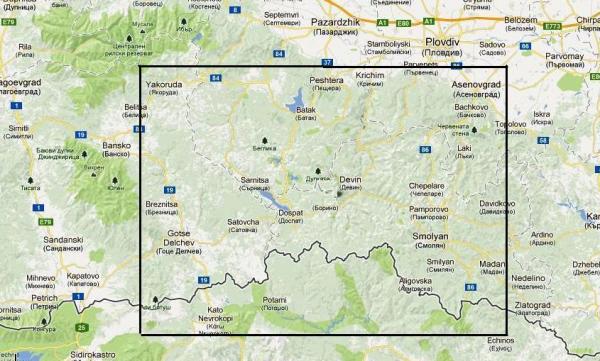 Gedetailleerde overzichtskaart van dit berggebied in Zuid-Bulgarije. Tweetalige tekst op de kaart, op de achterkant toeristische info over het gebied, o.m. in Engels. Doorgaande en belangrijke wandelpaden staan ingetekend.