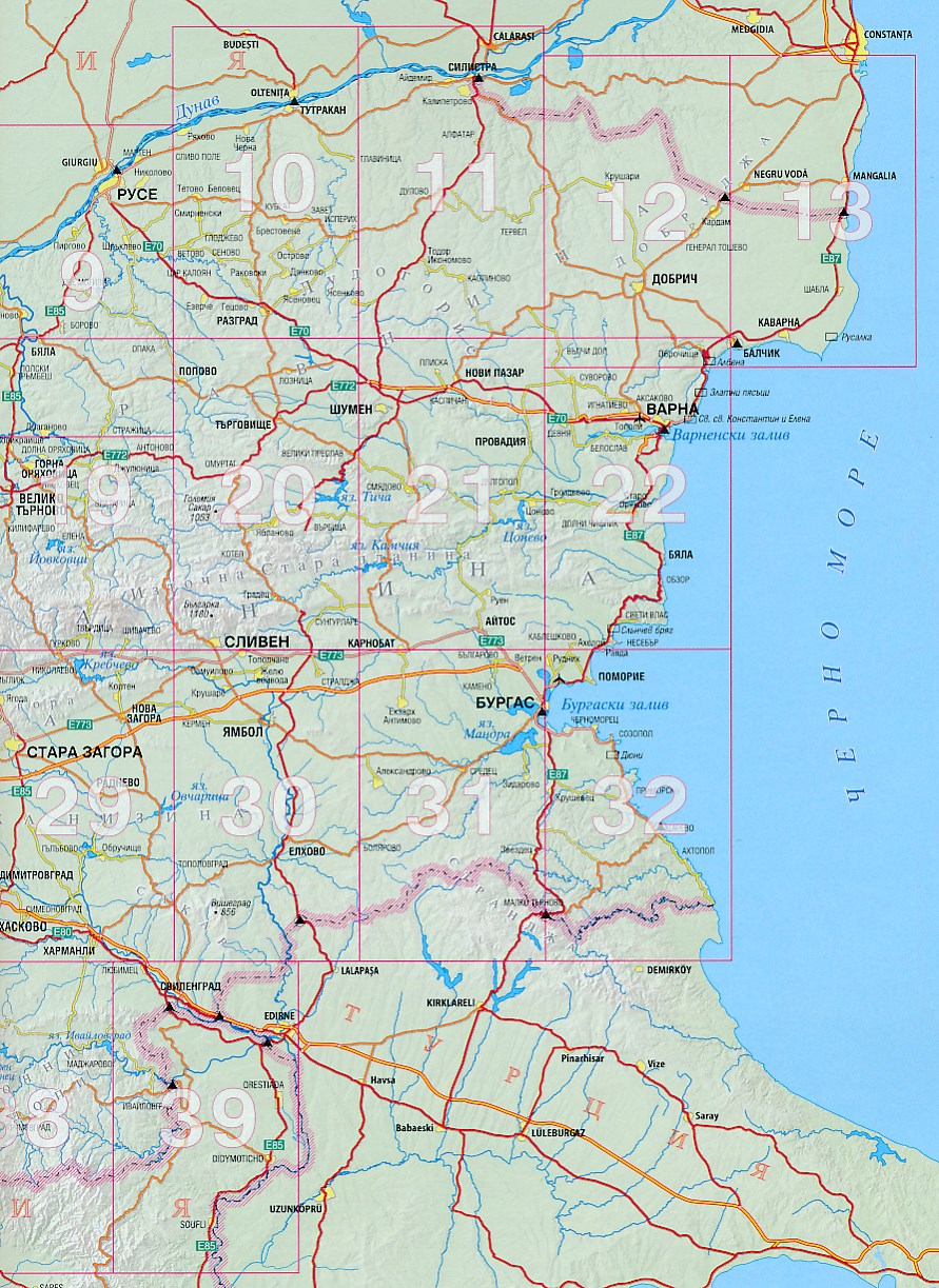 Detailed road atlas of Bulgaria. Nearly all place names on the maps are in Latin (English) and cycrillic script. Eight levels of roads are shown, from motorways to dirt tracks. Distances are shown between road junctions. Symbols located tourist sites and services such as spas, resorts, camp-sites, caves, airports, ports, border crossings, and much more. Includes a list of 100 national tourist sites, each with contact information. Fully indexed, but only in cyrillic.