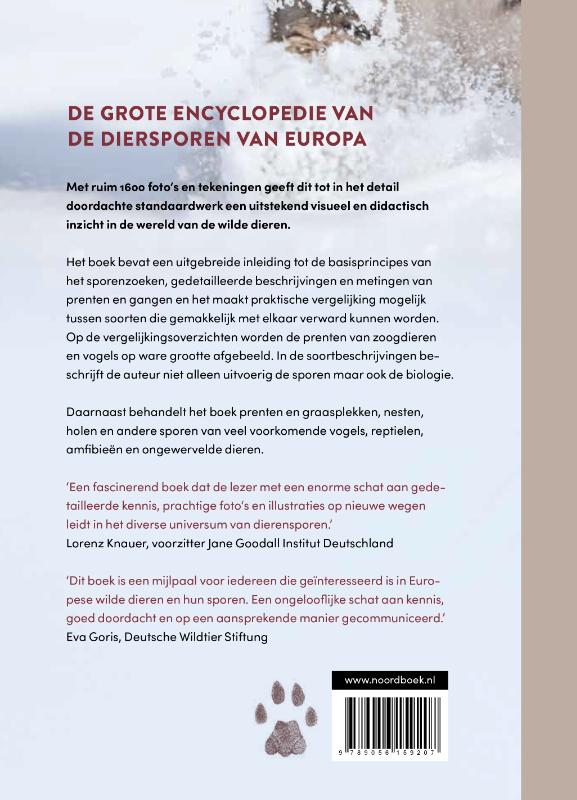 DE GROTE ENCYCLOPEDIE VAN DE DIERSPOREN VAN EUROPA Met ruim 1600 foto‘s en tekeningen geeft dit tot in het detail doordachte standaardwerk een uitstekend visueel en didactisch inzicht in de wereld van de wilde dieren. Het boek bevat een uitgebreide inleiding tot de basisprincipes van het spoorzoeken, gedetailleerde beschrijvingen en metingen van prenten en gangen en het maakt praktische vergelijking mogelijk met soorten die gemakkelijk met elkaar verward kunnen worden. De vergelijkingsplaten geeft de prenten weer van zoogdieren en vogels op ware grootte. In gedetailleerde portretten per diersoort beschrijft de auteur uitvoerig alle sporen, evenals de biologie. Tenslotte behandelt het boek prenten en graasplekken, nesten, holen en andere sporen van veel voorkomende vogels, reptielen, amfibieën en ongewervelde dieren. ‘Een fascinerend boek dat de lezer met een enorme schat aan gedetailleerde kennis, prachtige foto‘s en illustraties op nieuwe wegen leidt in het diverse universum van dierensporen.’ Lorenz Knauer, voorzitter Jane Goodall Institut Deutschland ‘Dit boek is een mijlpaal voor iedereen die geïnteresseerd is in Europese wilde dieren en hun sporen. Een ongelooflijke schat aan kennis, goed doordacht en op een aansprekende manier gecommuniceerd.’ Eva Goris, Deutsche Wildtier Stiftung