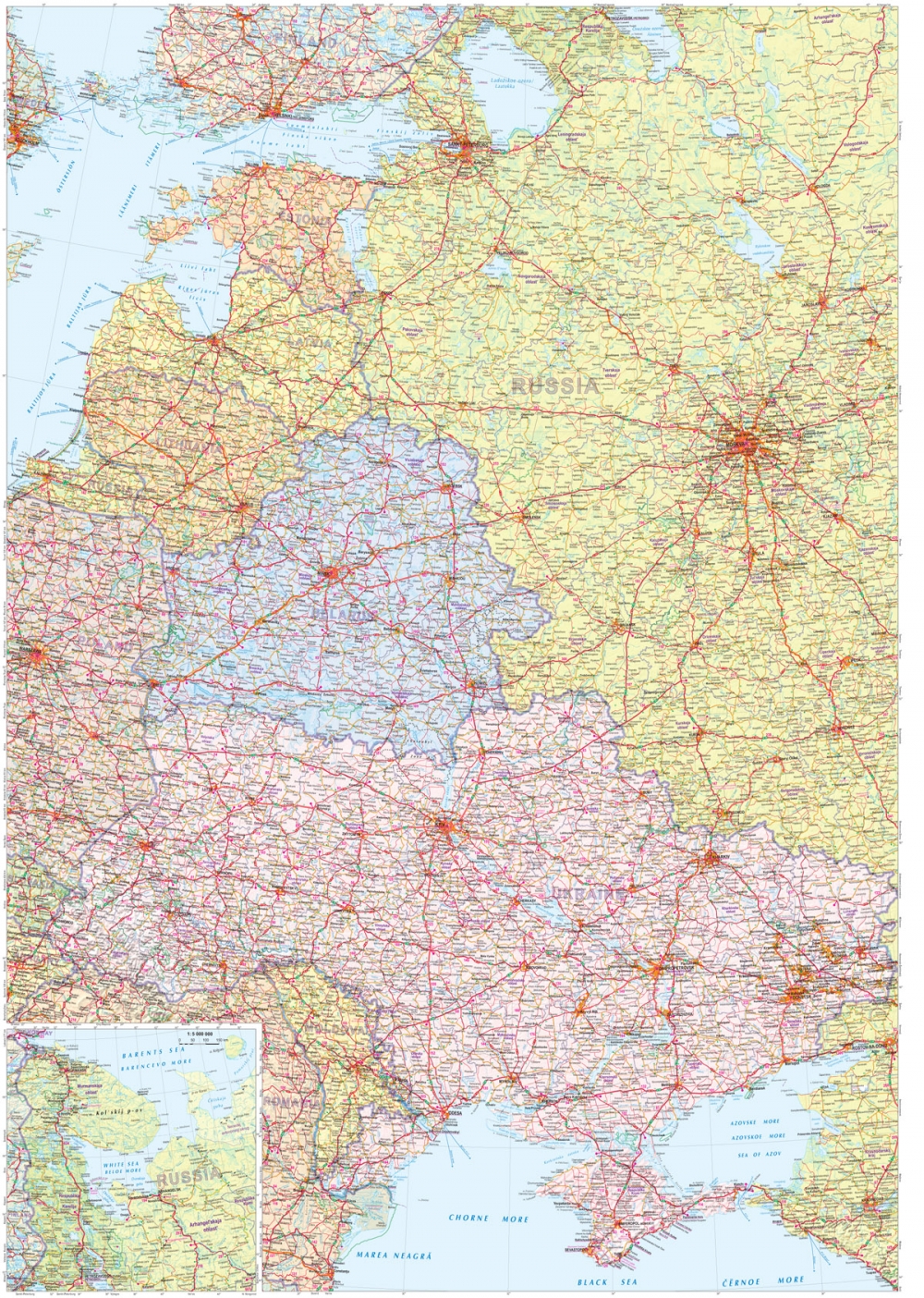 De wegenkaart van Oost-Europa is een overzichtelijke kaart voor mensen die naar Rusland, Oekraïne en Wit-Rusland gaan.Het beslaat het deel van Europa van het schiereiland Cola in het noorden tot de Kaukasus in het zuiden en van Polen in het Westen tot de Oeral in het oosten.