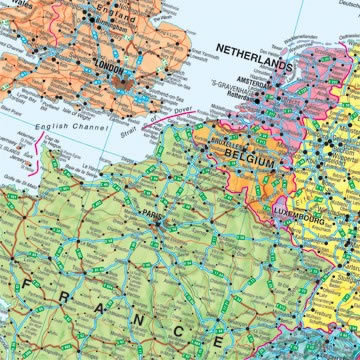Fraaie politieke kaart van het continent, waarbij vooral de politieke aspecten heel duidelijk te lezen zijn. Alle landen hebben verschillende kleuren, steden en belangrijke verbindingen zijn goed te vinden. Geplastificeerde uitvoering met blauw metalen strips boven en onder de kaart waardoor deze eenvoudig is op te hangen.