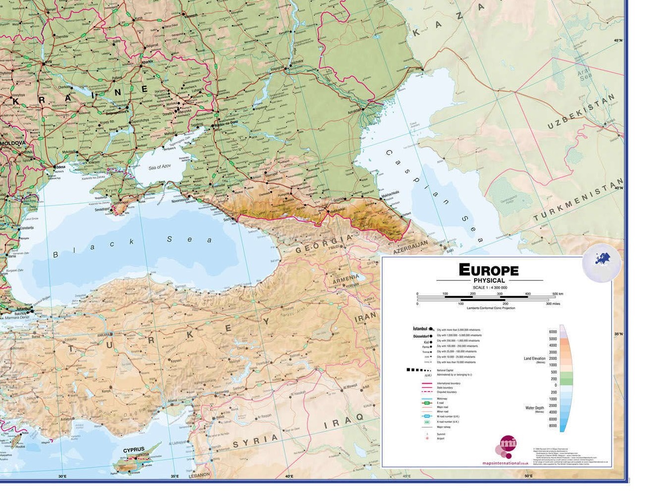 Map uses: As with most of our maps, the large physical wall map of Europe, is available in a range of finishes making it suitable for a variety of locations. Major motorways and transport lines are shown on this European wall map making it an ideal map for planning and logistics