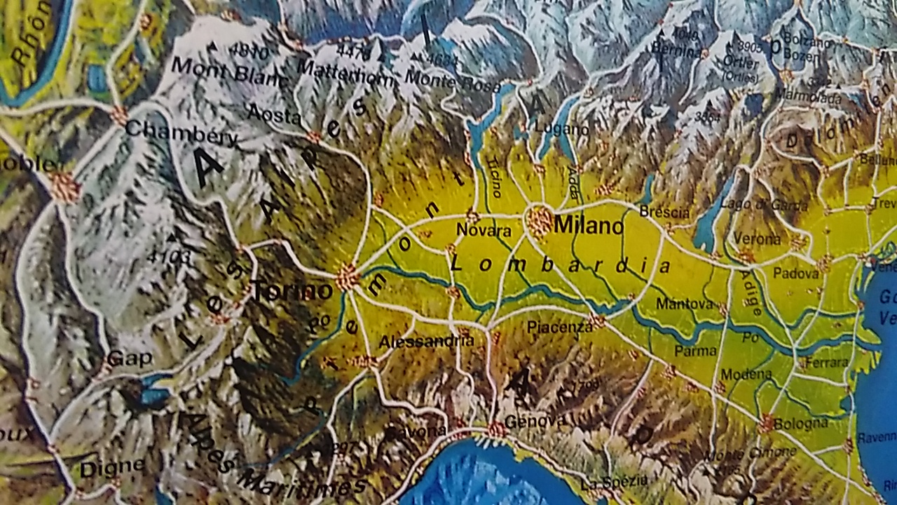 Der Blick des Betrachters wandert von der gleißenden Helle der Nordpol-Kappe über hellgrüne Wälder zu den weißen Gipfeln der Alpen. Weiter geht es über den Kaukasus bis zu den tiefblauen Gestaden des Mittelmeers, dessen Grund ebenfalls plastisch dargestellt ist. Das helle Gelb-Rot der afrikanischen Wüsten bildet gen Süden den Abschluß des Panoramas.