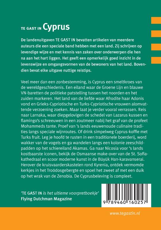 Behalve reisreportages bevat TE GAST IN Cyprus achtergrondartikelen. We horen wat voor een heidens werk het is om iconen te schilderen en staan stil bij de verzoeningspogingen van Grieks-Cypriotische en Turks-Cypriotische vrouwen. Tot slot bevat deze uitgave praktische reisinformatie, een woordenlijstje Grieks & Turks en verdere leestips.