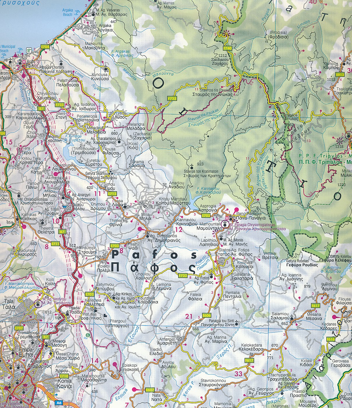 Deze wegenkaart van Cyprus bevat ook veel info over toeristische bezienswaardigheden. De tweetaligheid (Engels en Grieks) en de grote hoeveelheid informatie maakt de kaart wel moeilijk leesbaar en soms ontbreekt ook cruciale informatie over wegen, afritten e.d.
