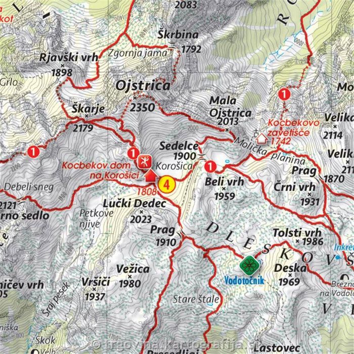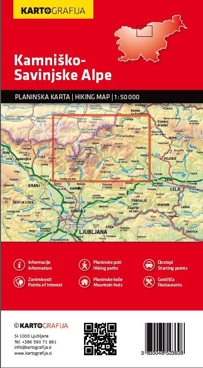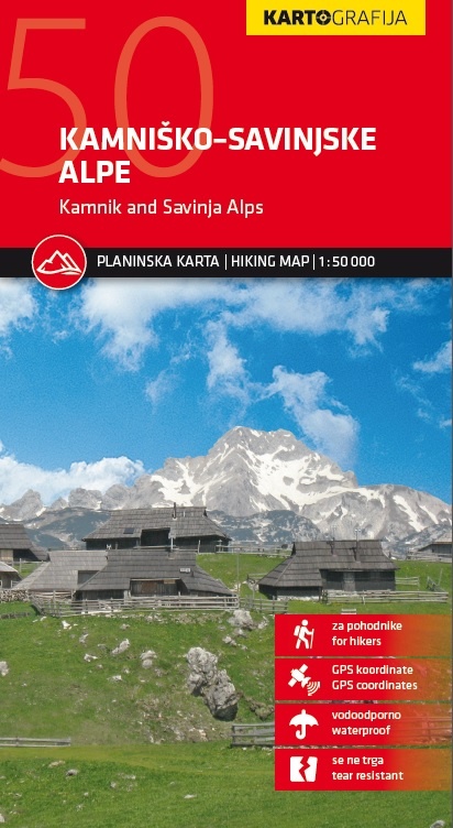 De Kamnik- en Savinja-Alpen in Slovenië op een lichte, waterbestendige en scheurbestendige, voorgevormde en GPS-compatibele kaart op 1: 50.000 van Kartografija, met op de achterkant details van lokale berghutten met foto's, QR-codes en kaartuittreksels. De cover omvat de top van Grintovec, en de overdruk voor wandel- en fietspaden strekt zich uit over de grens naar de Oostenrijkse kant van de bergen.Topografie wordt weergegeven met contouren op intervallen van 20 meter met schaduw en grafisch reliëf, plus voldoende hoogteverschillen. De bewegwijzerde wandelpaden geven moeilijke secties aan. Ook worden aanbevolen fietsroutes weergegeven. Meer dan 30 bergopvangplaatsen worden vergeleken met de informatie op de achterkant, met meer symbolen die vestigingen van andere toeristische accommodaties (inclusief campings, boerderijen met onderdak enz.), herbergen, klimplekken, uitzichtpunten, interessante natuurlijke of culturele locaties, enz. markeren. De kaarten hebben een raster voor lengte- en breedtegraad met intervallen van 1''.