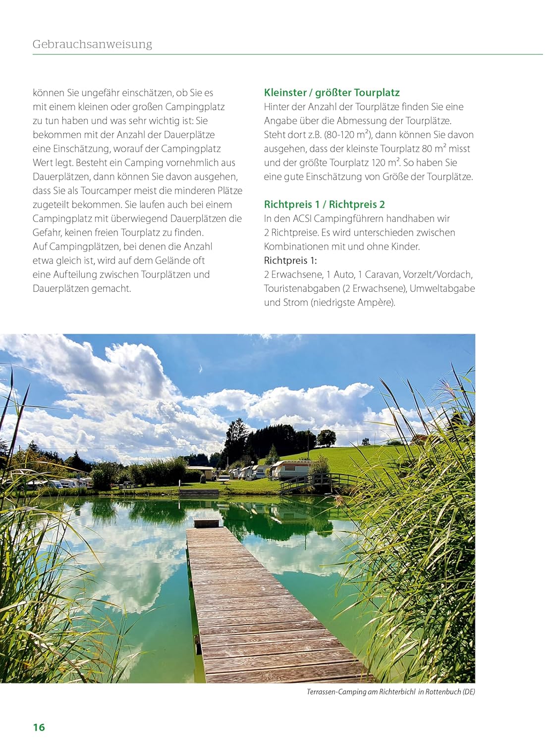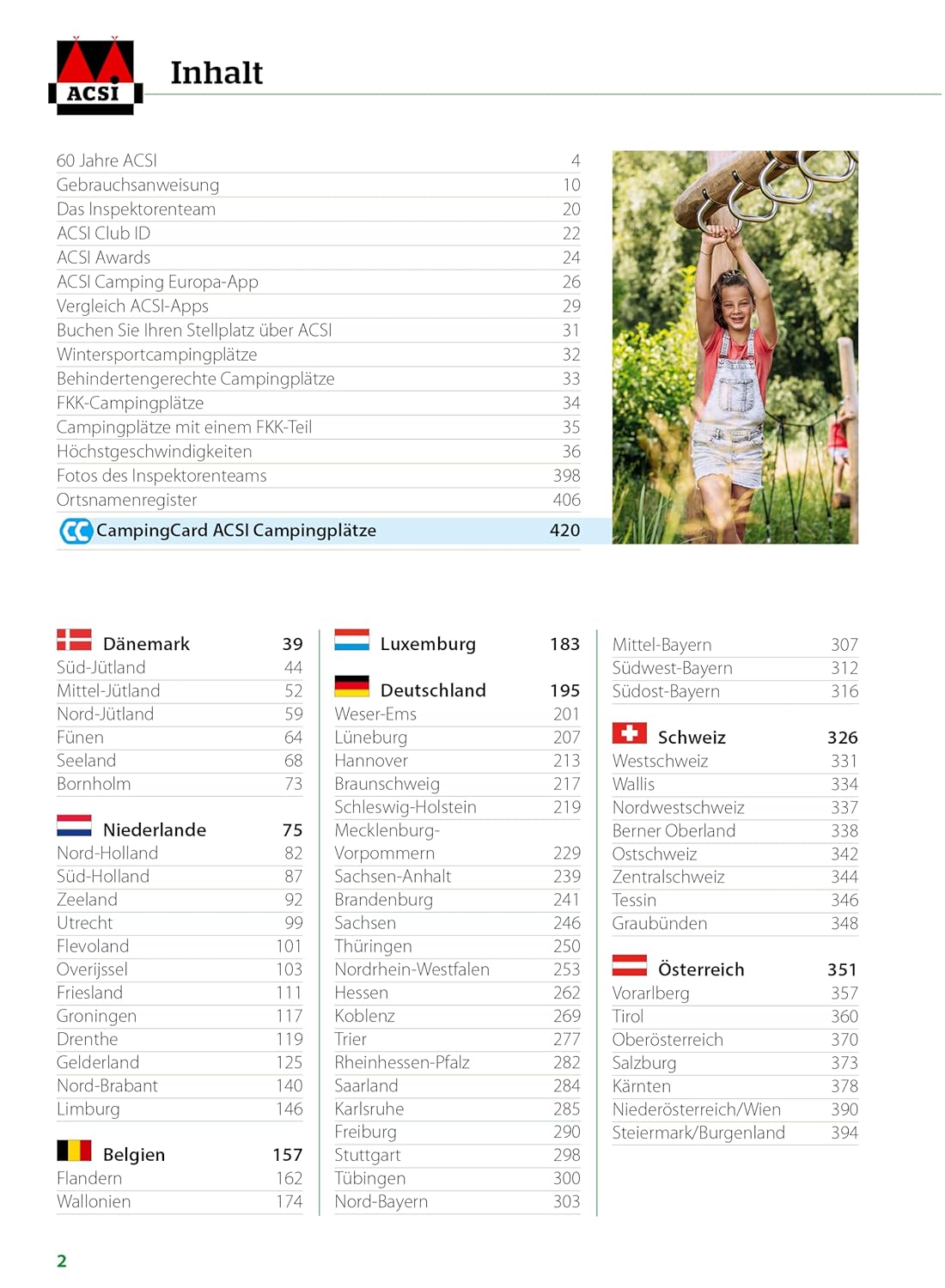 Der Campingführer enthält umfangreiche Informationen zu 2 334 Campingplätzen in Deutschland, der Schweiz, Österreich, Dänemark, den Niederlanden, Belgien und Luxemburg. Damit ist der Campingführer sehr praktisch – sowohl bei der Vorbereitung Ihres Campingurlaubs, als auch für unterwegs. Welches Ziel Sie auch ansteuern, mit dieser Übersicht haben Sie jederzeit alle Informationen griffbereit. Alle Campingplätze im Campingführer werden jährlich von unseren Inspektoren in Hinblick auf über 200 Ausstattungsmerkmale inspiziert. Das garantiert verlässliche und vollständige Informationen, mit denen Sie sorglos aufbrechen können. Zusätzlich erhalten Sie die CampingCard ACSI-Ermäßigungskarte, mit der Sie in der Nebensaison auf über 3 000 teilnehmenden Campingplätzen – alle im Campingführer enthalten – zu günstigen Tarifen campen können.
