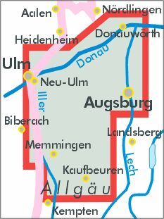 Auf ruhigen Wegen geht es von der Donau durch die sanft ansteigenden, weiten Flusstäler der Iller, Günz, Kammel und Zusam den Allgäuer Alpen entgegen. Die Landschaft des Alpenvorlandes mit bunten Wiesen und Wäldern ist geschmückt mit den barocken Kirchen Bayerisch-Schwabens. Entdecken Sie die Wunder der Natur im Naturpark „Augsburg-Westliche Wälder” und entlang der Flussläufe in Biotopen und Flussauen, an Stauseen und im Naturschutzgebiet „Donaumoos”.