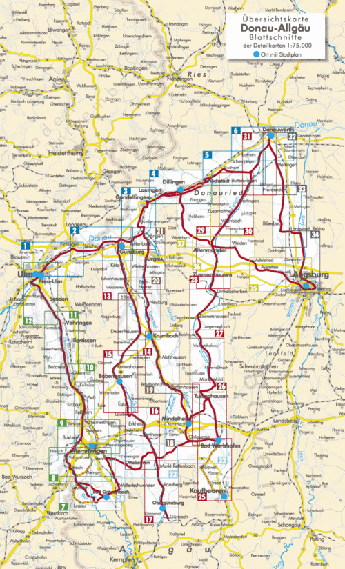 Praktische fietsgids met detailkaarten, ingetekende route, informatie over overnachten en fietsenmakers, zwaarte en hoogteprofiel. In spiraalbinding, Duitstalig.Tochten van totaal 580 km tussen Ulm en Augsburg.