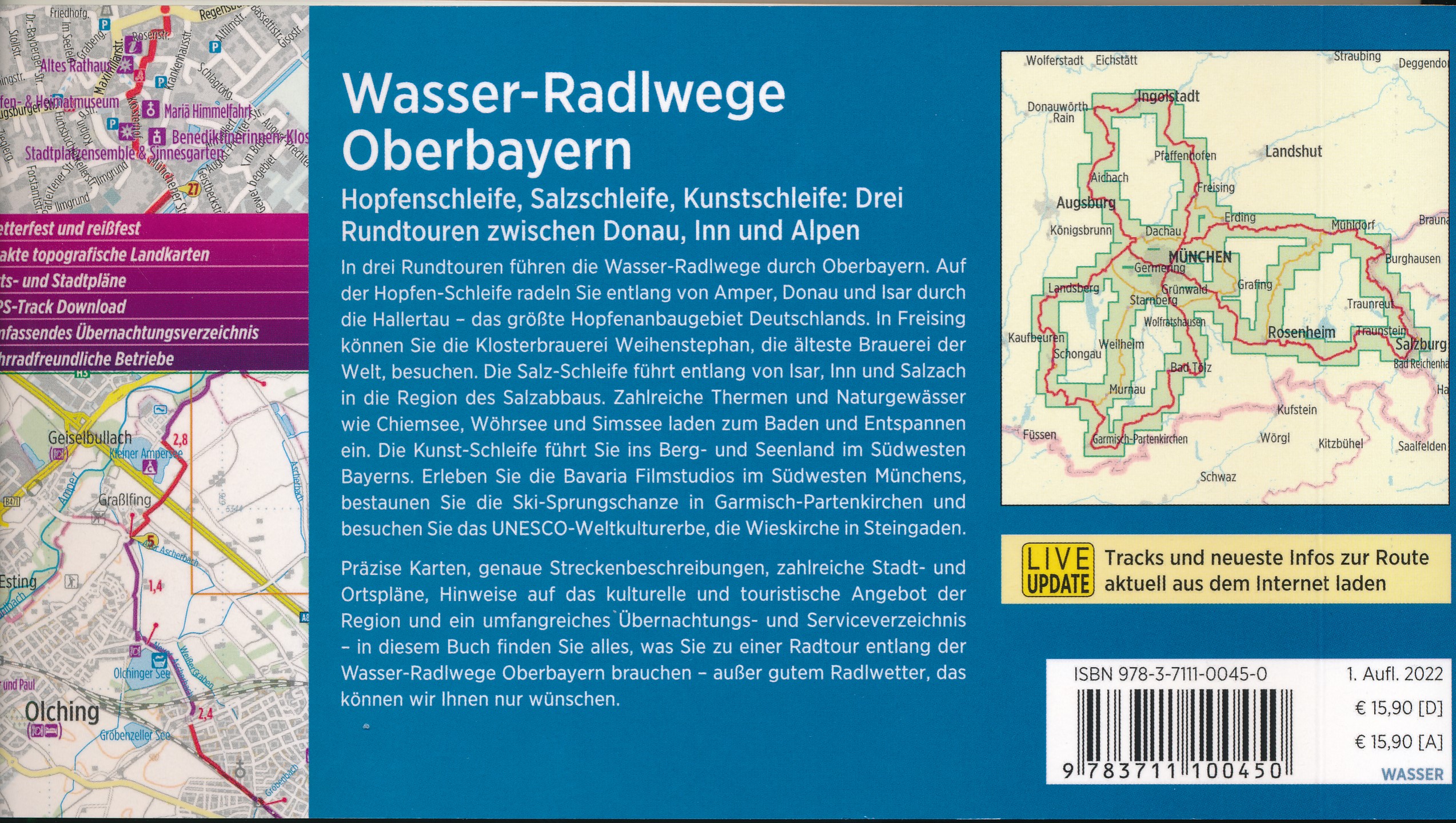 In drei Rundtouren führen die Wasser-Radlwege durch Oberbayern. Auf der Hopfen-Schleife radeln Sie entlang von Amper, Donau und Isar durch die Hallertau – das größte Hopfenanbaugebiet Deutschlands. In Freising können Sie die Klosterbrauerei Weihenstephan, die älteste Brauerei der Welt, besuchen. Die Salz-Schleife führt entlang von Isar, Inn und Salzach in die Region des Salzabbaus. Zahlreiche Thermen und Naturgewässer wie Chiemsee, Wöhrsee und Simssee laden zum Baden und Entspannen ein. Die Kunst-Schleife führt Sie ins Berg- und Seenland im Südwesten Bayerns. Erleben Sie die Bavaria Filmstudios im Südwesten Münchens, bestaunen Sie die Ski-Sprungschanze in Garmisch-Partenkirchen und besuchen Sie das UNESCO-Weltkulturerbe, die Wieskirche in Steingaden