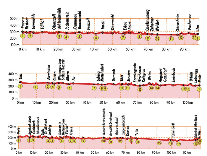 Die Länge des Donau-Radweges mit Start in Passau und Ziel in Wien beträgt rund 320 Kilometer. Die Ausflüge und Varianten haben eine Länge von etwa 160 Kilometern.