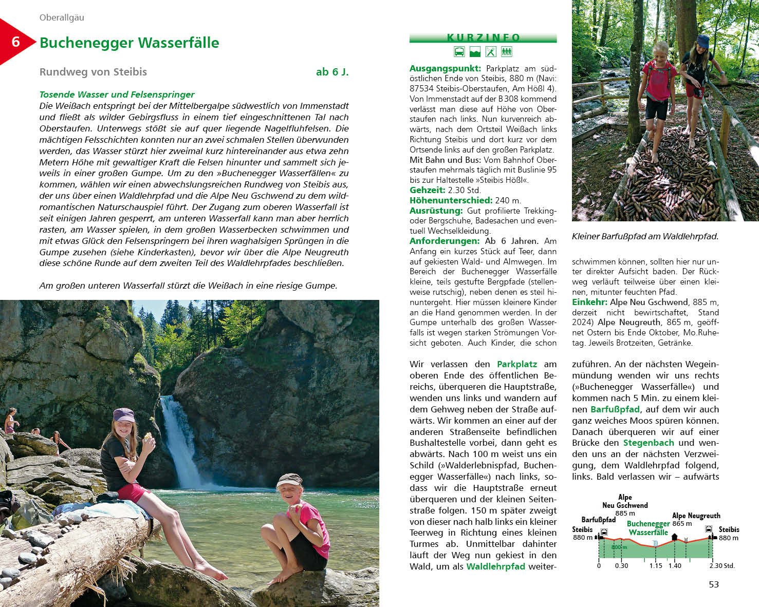 Das Allgäu ist ein Abenteuerland. Spannende Erlebnisspielplätze und geheimnisvolle Burgruinen, wunderschöne Gipfeltouren und traumhafte Barfußwiesen sowie unzählige Spielmöglichkeiten an rauschenden Wasserfällen und glitzernden Bergseen verzaubern Groß und Klein!Die 30 Wandervorschläge in dem Wanderbuch »ErlebnisWandern mit Kindern – Allgäu« haben alle ein besonderes Highlight für Kinder zu bieten, vom Klammweg, über zu zahme Tiere auf der Alp bis zu kindergeeigneten Klettersteigen. Oft lässt sich die Tour mit einem der zahlreichen Freizeitangebote im Allgäu verbinden, wie zum Beispiel mit einer rasanten Talfahrt auf der Sommerrodelbahn oder einem Besuch in der Erzgruben-Erlebniswelt. Der ergänzende Serviceteil bietet zahlreiche weitere Freizeit- und Schlechtwettertipps.