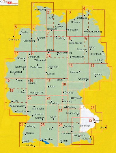 Speciaal voor fietsers gemaakte kaart, waarbij juist de autowegen minder duidelijk te lezen zijn, maar waar de fietspaden gekleurd staan weergegeven. De kleur varieert naarmate de weg beter als fietsroute geschikt is. Lange afstands fietsroutes staan ingetekend, alsmede fietsenmakers, campings en interessante toeristische bezienswaardigheden. Groot voordeel van deze kaartenserie is bovendien dat het een heel groot gebied per kaart bestrijkt: ca. 130 x 160 km.!