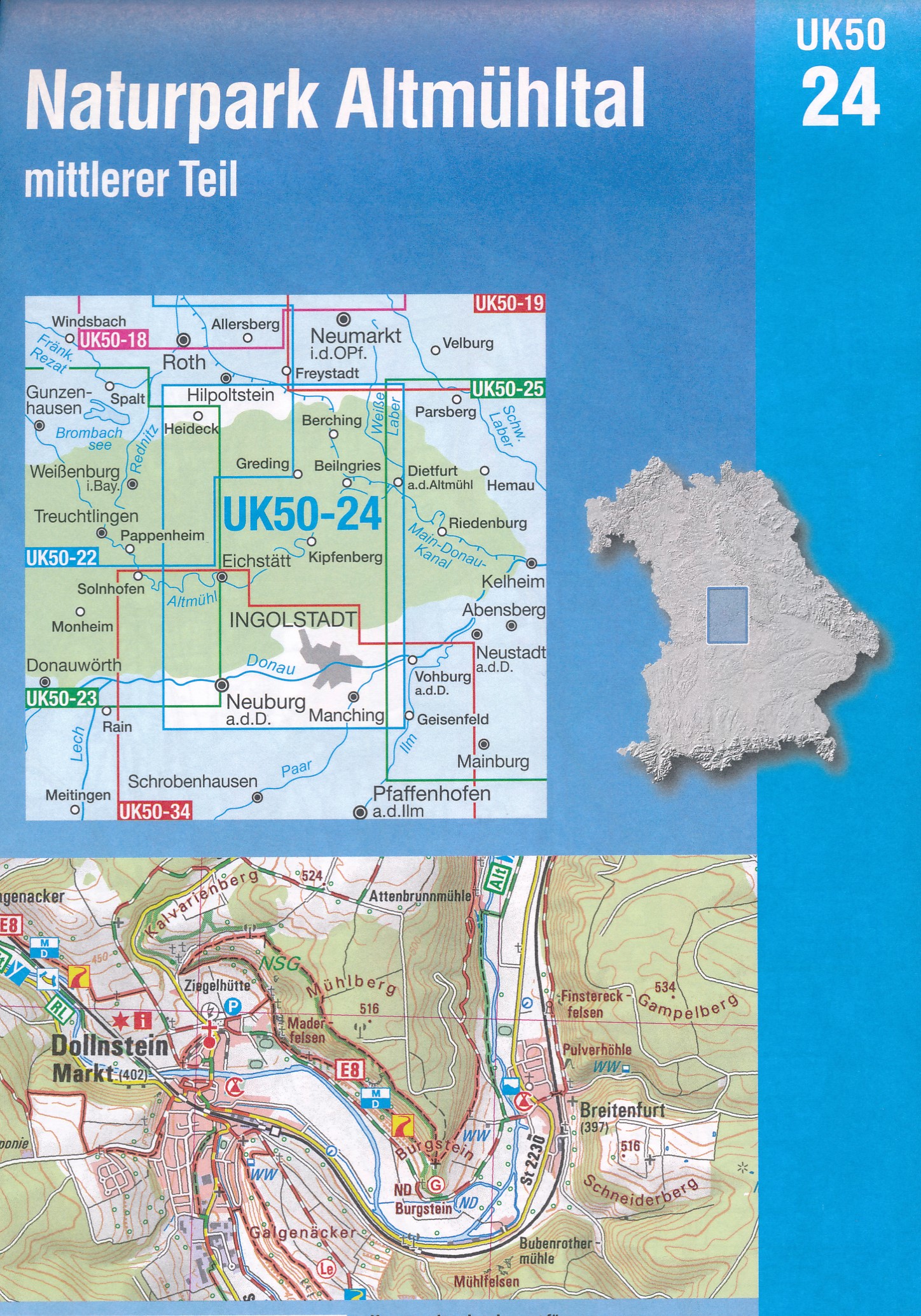 Gedetailleerde topografische kaart van een deel van Beieren met veel toeristische informatie en veel ingetekende wandelroutes. Ook de doorgaande wandelroutes staan ingetekend met o,a. de Altmühltal-Panoramaweg, Frankenweg, Jakobsweg