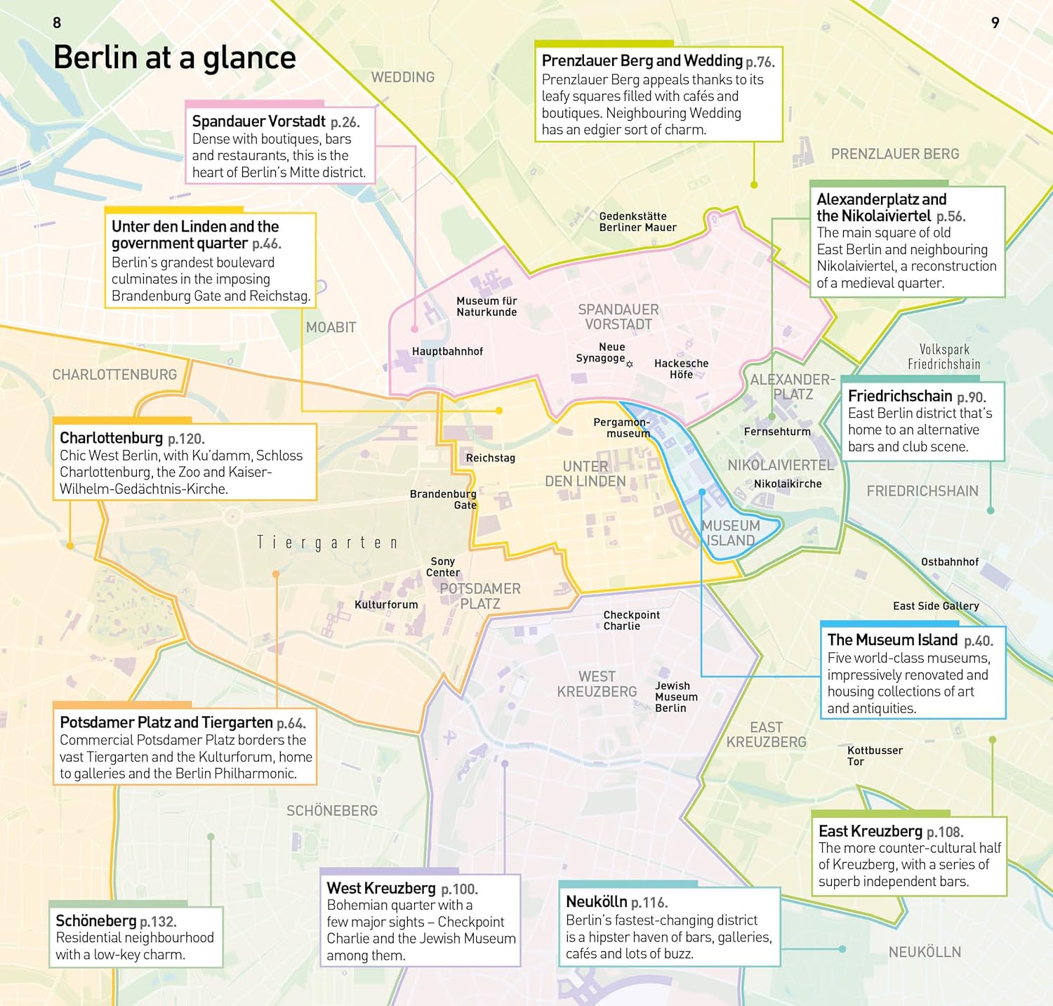Verdeling op kleur en per stadsdeel zorgt voor overzicht. Per wijk worden enkele bezienswaardigheden, accomodaties, eetgelegenheden etc uitgelicht, net als bij de volledige gidsen alleen dan in een wat beknoptere variant. De metro kaart voorin erg handig, de kleinere wijkkaarten per stadsdeel ook. Het uitvouwbare kaartje van de stad wat klein en daardoor niet heel praktisch leesbaar. Voldoet voor een overzicht, voor het vinden van de route etc werken de wijkkaarten beter wanneer je je in de betreffende bevindt