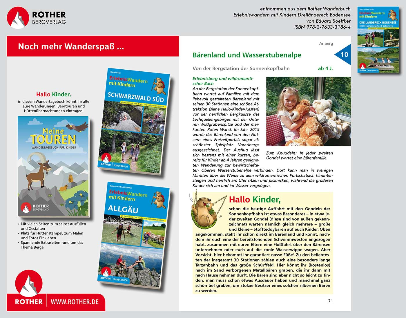 In dieser Region ist alles geboten, was das Herz begehrt: Auf urigen Alpen lassen sich Tiere streicheln, aufregend ist der Weg durch eine enge Klamm, mit der Sommerrodelbahn geht es rasant den Berg hinunter. Badepausen lassen sich in kleinen Bergseen wie auch im großen Bodensee einlegen. Auch ein Bergwildpark, eine Floßfahrt oder eine Tarzan-Bahn über einen Bach werden Groß und Klein viel Spaß bereiten. Und sollte es mal regnen: Der ergänzende Serviceteil hält über 20 weitere Freizeit- und Schlechtwettertipps bereit.