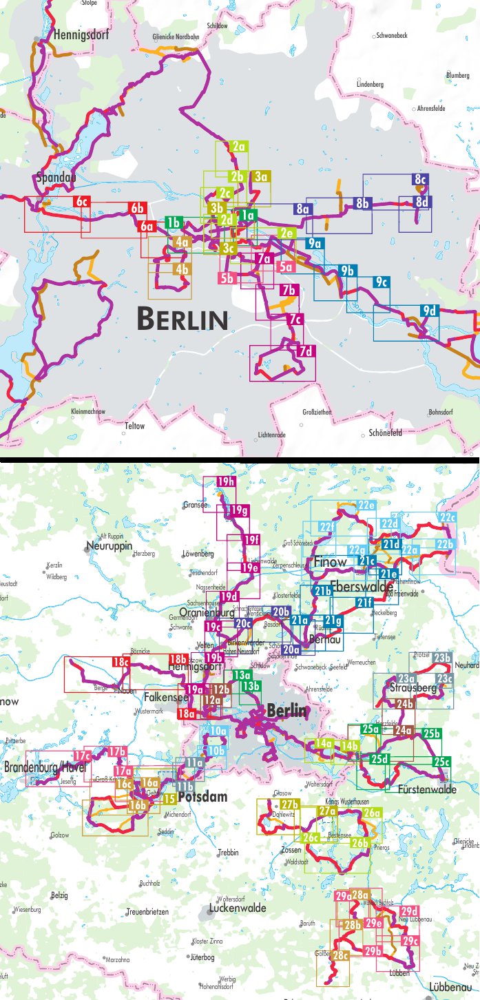 Praktische fietsgids met detailkaarten, ingetekende route, informatie over overnachten en fietsenmakers, Met zwaarte en hoogteprofiel. In spiraalbinding. Lange en korte routes mogelijk, in en rondom Berlijn.
