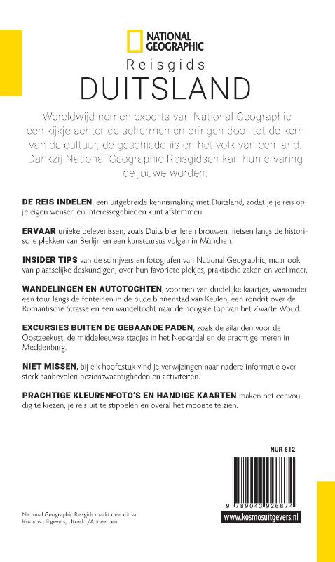 National Geographic Reisgids Duitsland is een exclusieve gids met sublieme fotografie die u meeneemt naar de bekende en minder bekende bezienswaardigheden. De experts van National Geographic nemen een kijkje achter de schermen en dringen door tot de kern van de cultuur, de geschiedenis en het volk van het land. Bezoek met deze National Geographic Reisgids Duitsland de grote steden als Berlijn, Frankfurt en Keulen en natuurgebieden als het Zwarte Woud, de Eifel en Sauerland. Of ervaar unieke belevenissen, zoals Duits bier leren brouwen, fietsen langs de historische plekken van Berlijn, een excursie maken langs de prachtige meren in Mecklenburg en een kunstcursus volgen in München. De uitgebreide kennismaking met Duitsland, het overzicht met belevenissen die je niet mag missen, de insider tips, de excursies buiten de gebaande paden en de reiswijzer met hotels en restaurants en de handige kaarten maken de gids compleet. Speciaal aanbevolen voor natuur- en cultuurliefhebbers!
