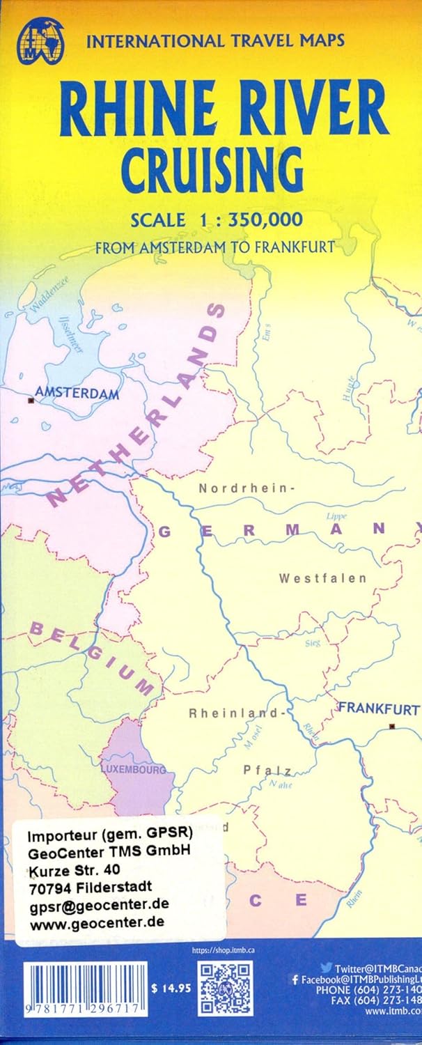 The Rhine River flows from the Gletch Glacier in the Swiss Alps north to central Germany and then on to Amsterdam and the North Sea. It has been a major transportation link in Europe for many centuries, with dozens of castles located at strategic points. Today, it is a peaceful touristic haven as well as a busy working river, with dozens of shallow-draft boats wending their way around countless turns in the river. It is probably the busiest tourist highway in Europe. This double-sided map starts in Amsterdam, where it is known as the Waal, and follows the course of the river inland past Nijmegen to the German border, where the name changes to Rhine. There are many notable interesting cities along its route, such as Essen in the Ruhr Valley, Dusseldorf, Koln, with its magnificent cathedral, Bonn, Castle Arenfels, Koblenz, and Rüdesheim, where it joins the Main River and heads east to Frankfurt-on-Main and points east. As a map is a rectangular sheet of paper and a river is a narrow portion wending its way as geography takes it. This is much more than a simple river map. It is a detailed portrayal of a very interesting part of Europe, extending far beyond the banks of the river, and is ideal for those travelling by car, by train, or by river boat. A detailed city centre map of Frankfurt is included.