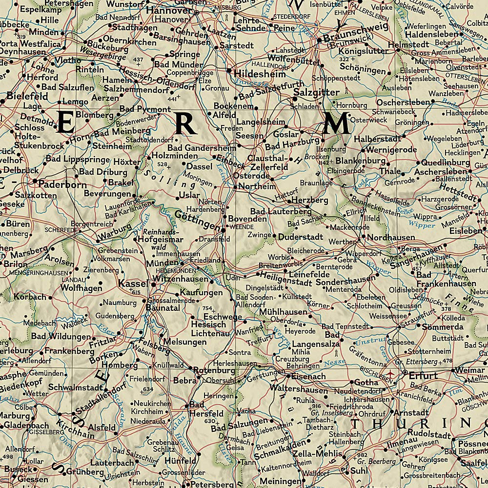 Complete political actual detail of Germany - country boundaries, roads and cities, airports, bodies of water, and other geographic details in antique style.