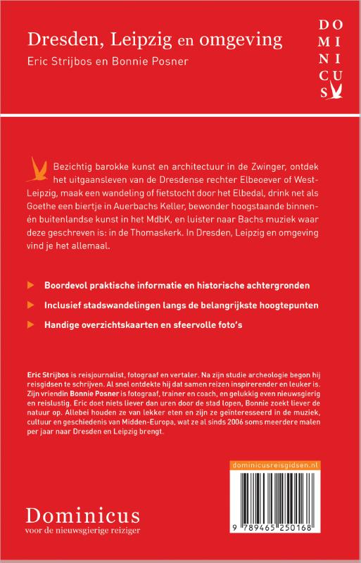 Ontdek Dresden, Leipzig en omgeving op vakantie in Duitsland met deze Dominicus-reisgids en verken twee bruisende steden en de prachtige, rijke natuurgebieden eromheen. Bezoek Dresden en ontdek het bruisende uitgaansleven, het sfeervolle stadscentrum en beklim de Frauenkirche voor het mooie uitzicht over de stad. Vergaap je aan het Brühlsche Terras, de meest romantische plek in Dresden waar je uitkijkt op de Elbevallei. Verblijf in Leipzig en bezoek de Panoramatoren in het hart van de stad of bezoek een van de bekendste kerken van Leipzig, de Nicolaaskerk. Deze reisgids zit boordevol praktische informatie, historische achtergronden, handige overzichtskaarten, sfeervolle foto's en uitgebreide culturele achtergrondinformatie. Bovendien zijn Dominicus-reisgidsen altijd up-to-date en geschreven door Nederlandstalige experts. Eric Strijbos is reisjournalist, fotograaf en vertaler, Bonnie Posner is fotograaf en trainer-coach. Samen hebben ze diverse Dominicusgidsen geschreven en zijn ze al meer dan vijftien jaar in alle seizoenen in Dresden en Leipzig te vinden.