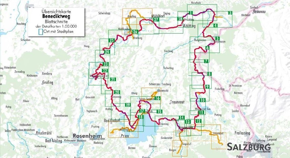 Auf den Spuren von Papst Benedikt XVI. führt Sie dieser Radweg durch das Gebiet zwischen Inn, Salzach und Chiemsee. Auf meist ruhigen Feld- und Waldwegen sowie auf Radwegen geht es zu den Kindheits- und Jugendstationen des Papstes, zu zahlreichen Kirchen und Klöstern sowie zu bekannten Wallfahrtsorten wie Altötting und Maria Eck. Neben diesen religiösen Highlights beeindruckt diese Tour aber auch durch die Besuche sehenswerter Städte wie z. B. Burghausen, Wasserburg und Tittmoning sowie durch die reizvolle Landschaft auf die Sie von einem besonderen Platz, der Ratzinger Höhe, einen weitreichenden Ausblick haben.