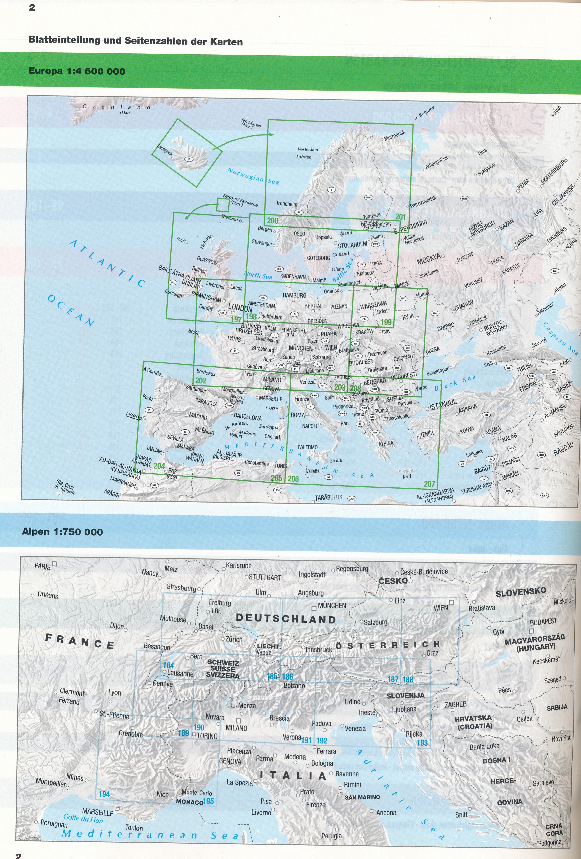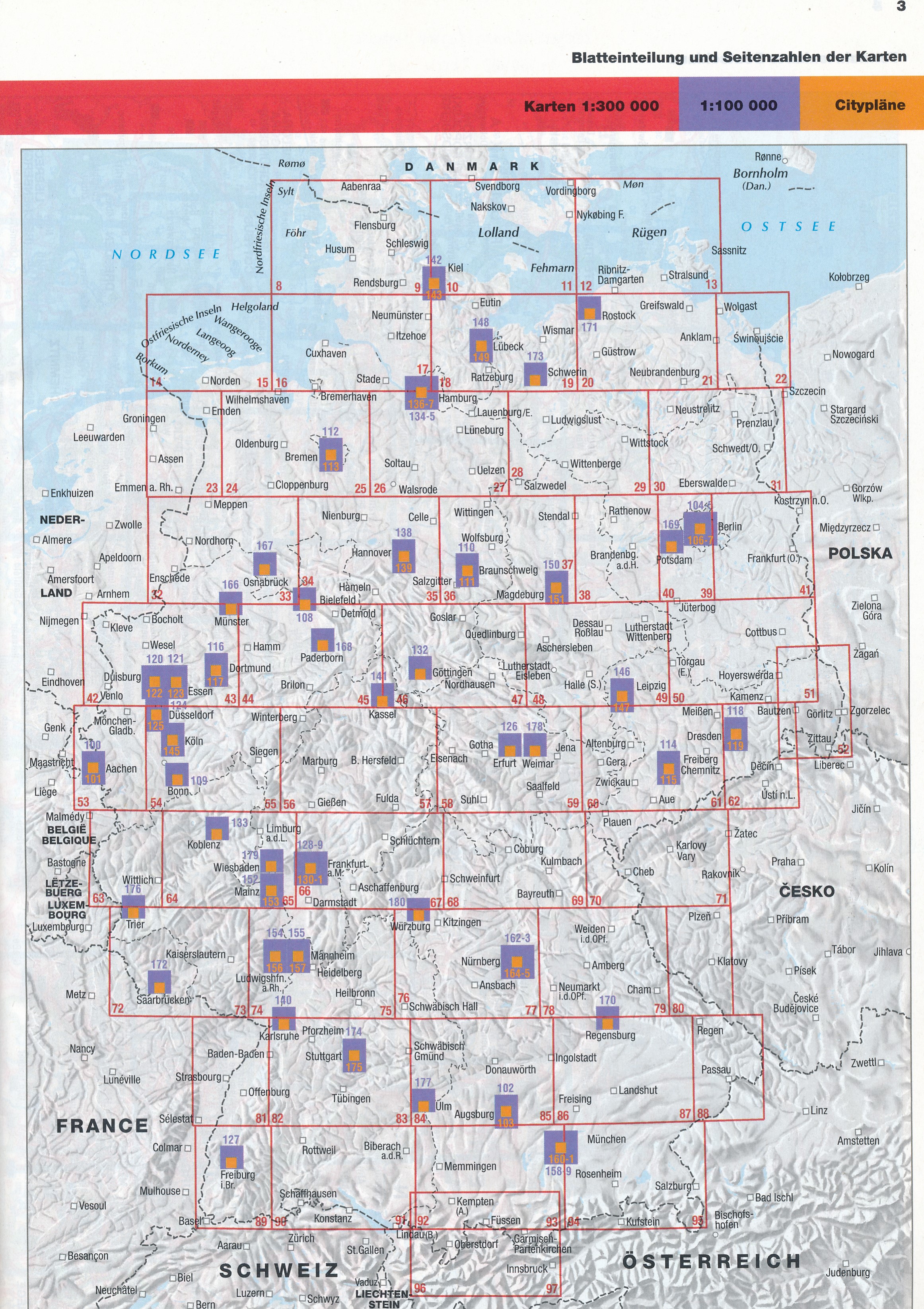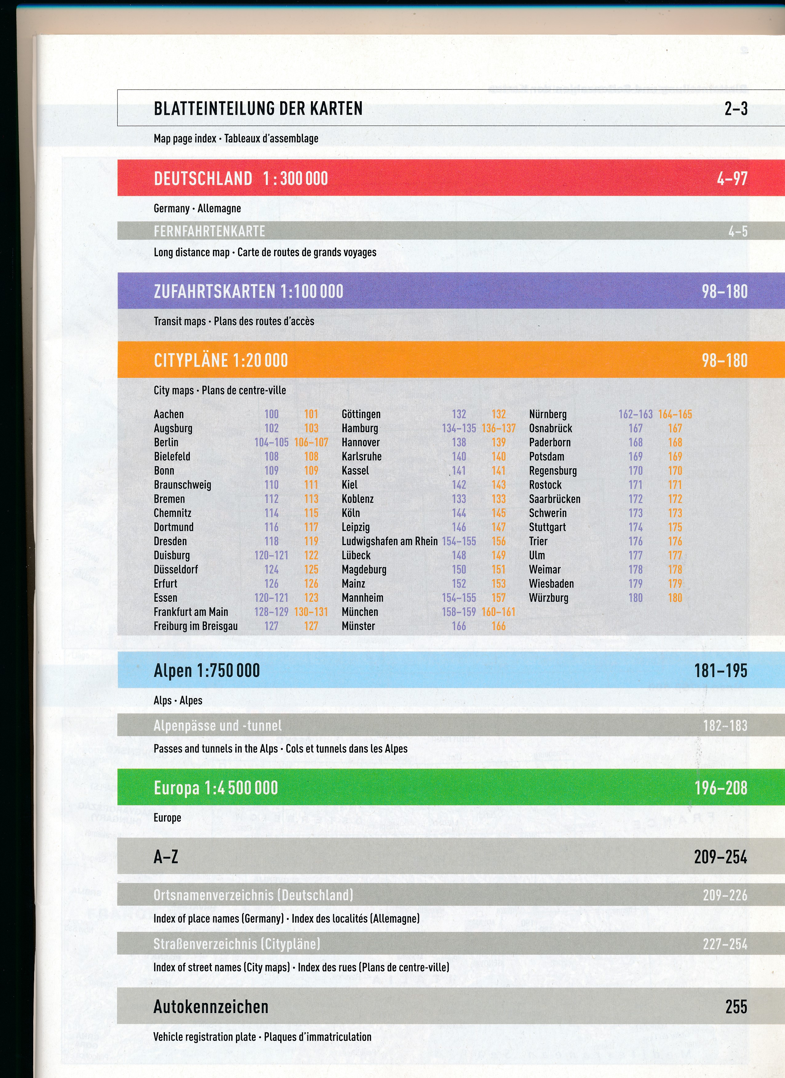 Der Kartenteil mit mehrsprachiger Legende (D,GB,F): Hauptkarte Deutschland im Maßstab 1:300 000 mit Fernfahrtenkarte als Übersicht; Europa im Maßstab 1:4 500 000; Alpen im Maßstab 1:750 000; 46 Zufahrtskarten im Maßstab 1:100 000 und Citypläne im Maßstab 1:20 000: Aachen, Augsburg, Berlin, Bielefeld, Bonn, Braunschweig, Bremen, Chemnitz, Dortmund, Dresden, Duisburg/Essen, Düsseldorf, Erfurt, Frankfurt am Main, Freiburg im Breisgau, Göttingen, Hamburg, Hannover, Karlsruhe, Kassel, Kiel, Koblenz, Köln, Leipzig, Lübeck, Magdeburg, Mainz, Mannheim/Ludwighafen am Rhein, München, Münster, Nürnberg, Osnabrück, Paderborn, Potsdam, Regensburg, Rostock, Saarbrücken, Schwerin, Stuttgart, Trier, Ulm, Weimar, Wiesbaden, Würzburg. Serviceteil: Alpenpässe und -tunnel; Ortsnamenverzeichnis von Deutschland; Straßenverzeichnis der Citypläne; Autokennzeichen.